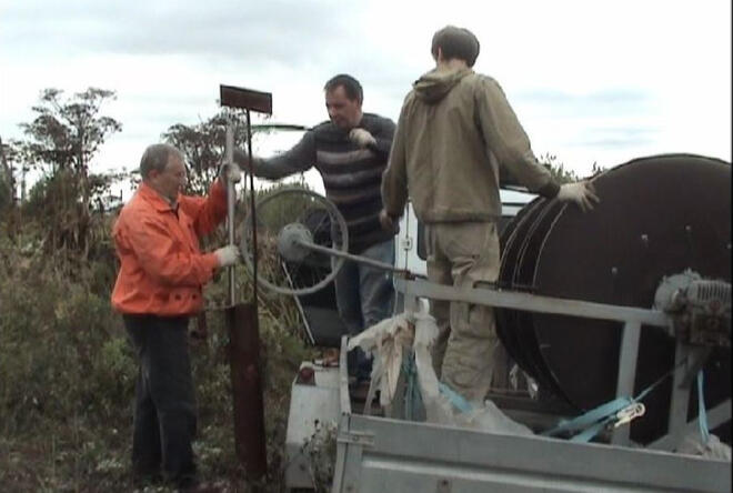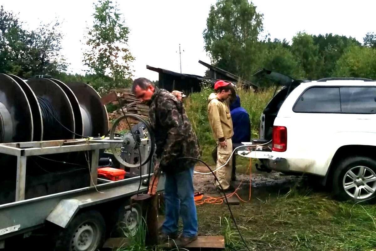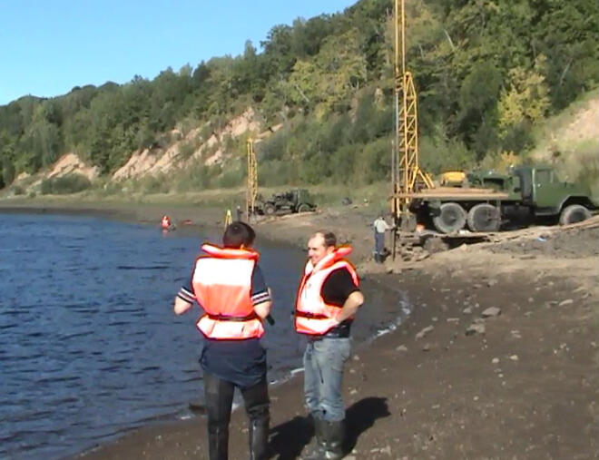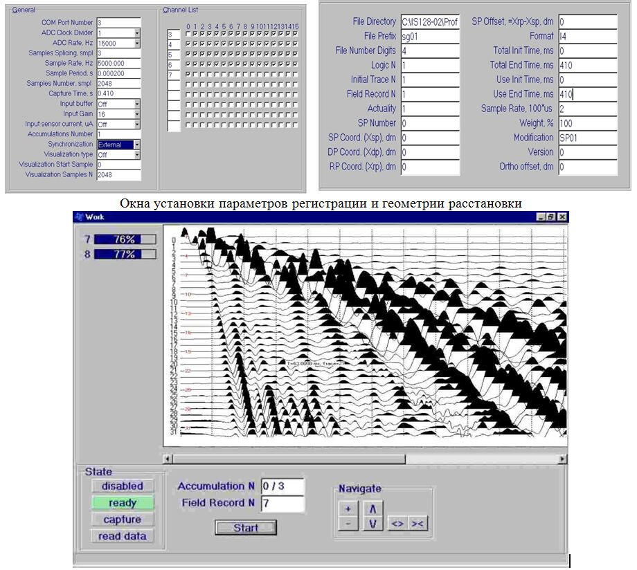 Для регистрации упругих волн на сухопутных участках использовались 48-ми канальные геофонные расстановки с шагом каналов 5 м. В русле реки прием сигналов велся с использованием плавающих или укладываемых на дно гидрофонных кос с пьезодатчиками давления. Для возбуждения колебаний применялись взрывы динамитных зарядов весом 200-600 г.