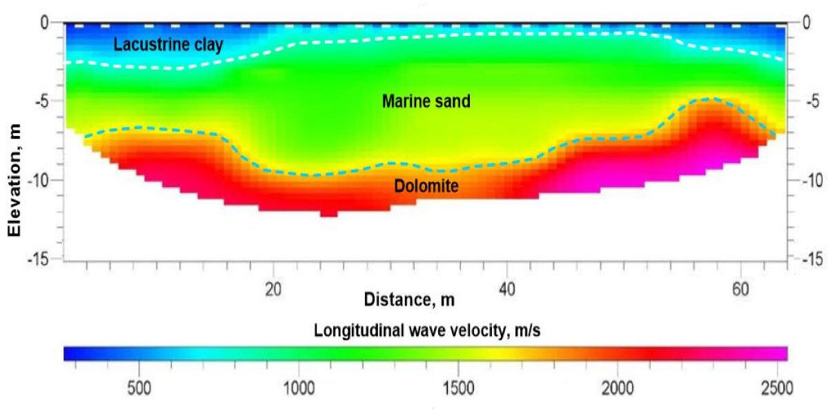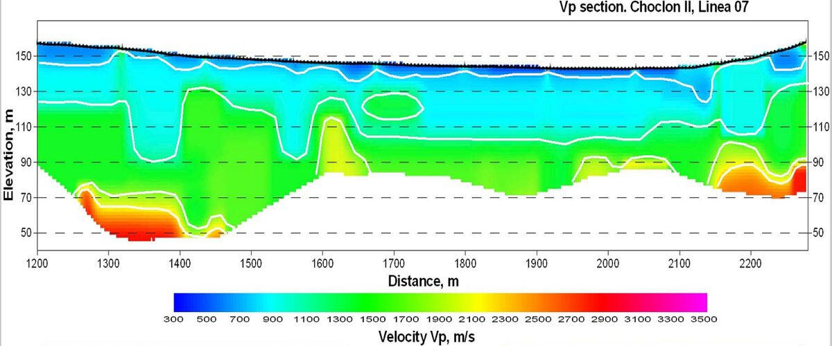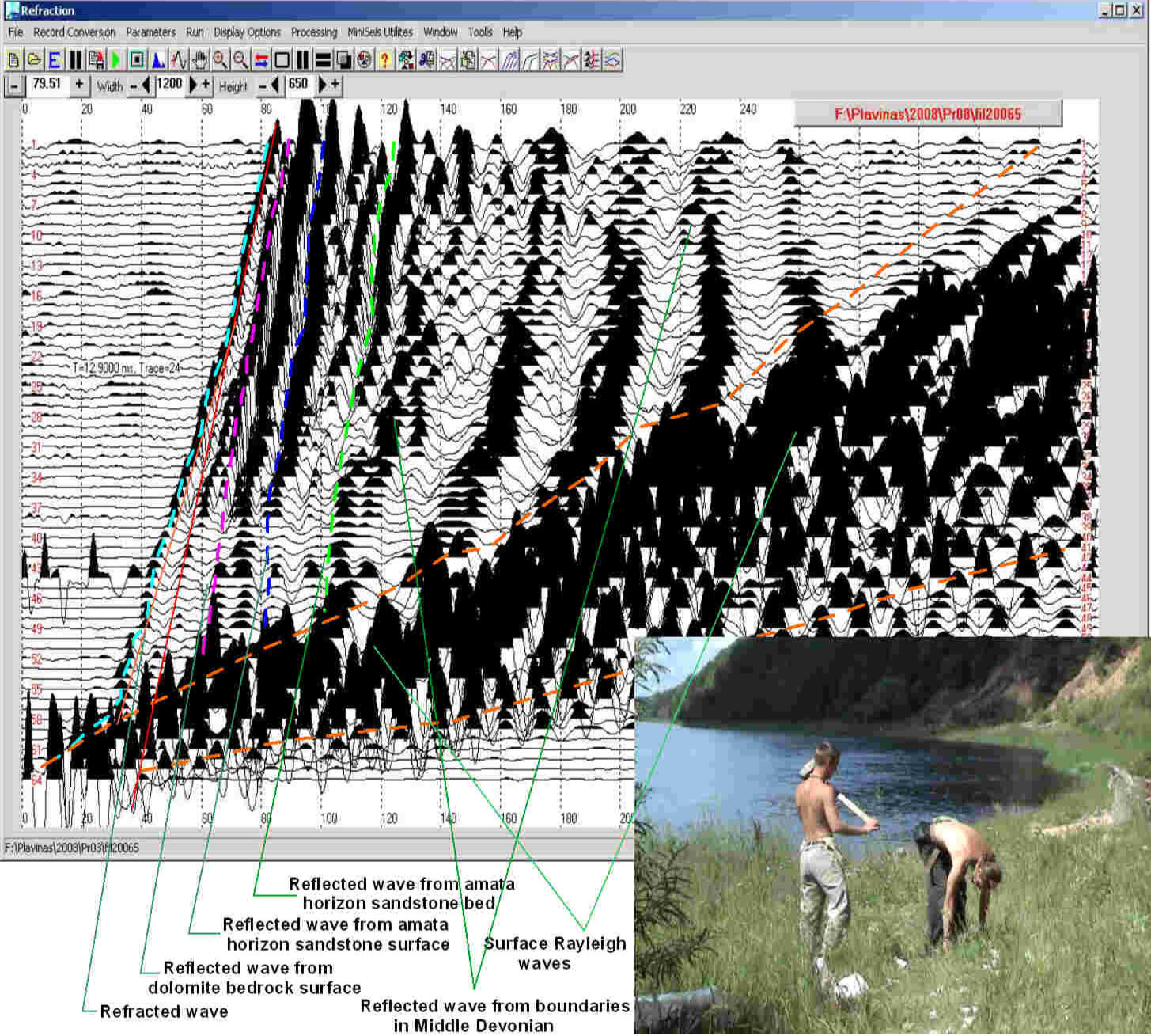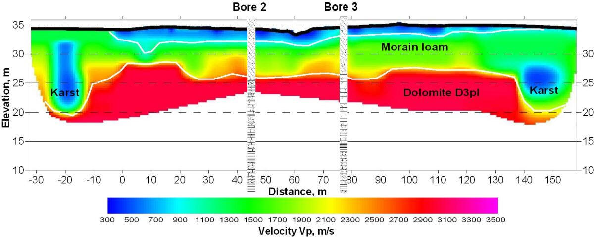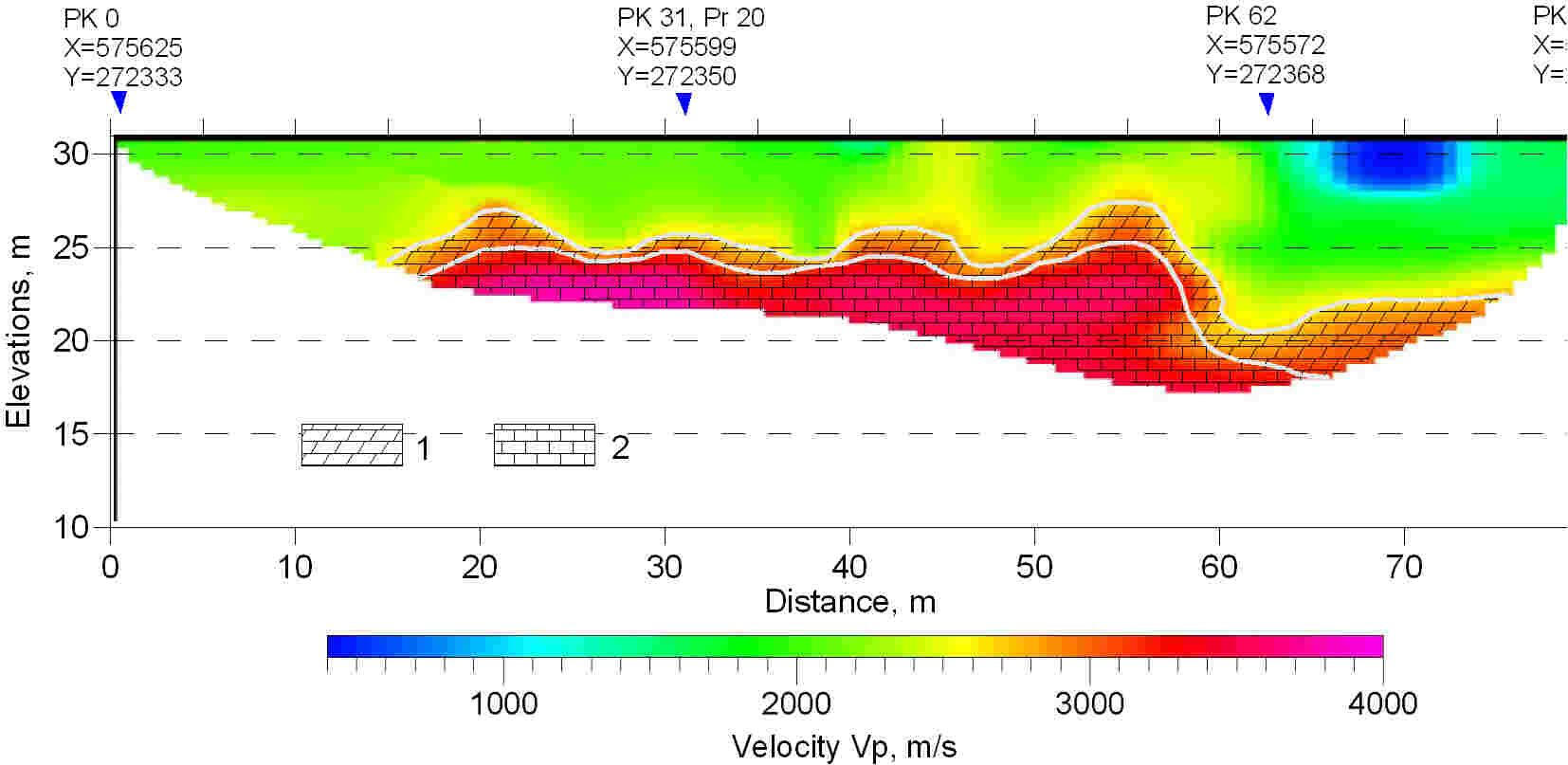 Для определения глубины залегания коренных доломитов использовались разрезы скоростей распространения продольных волн, рассчитанные по данным метода рефрагированных волн. Положение поверхности доломитов в неосушенной части русла шириной порядка 105 м получены по сейсмозаписям с приемной расстановки, расположенной на острове и возбуждении колебаний на берегу.