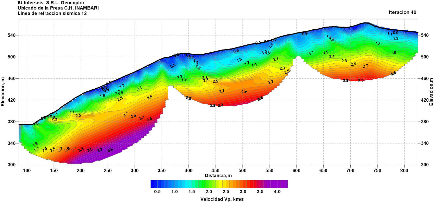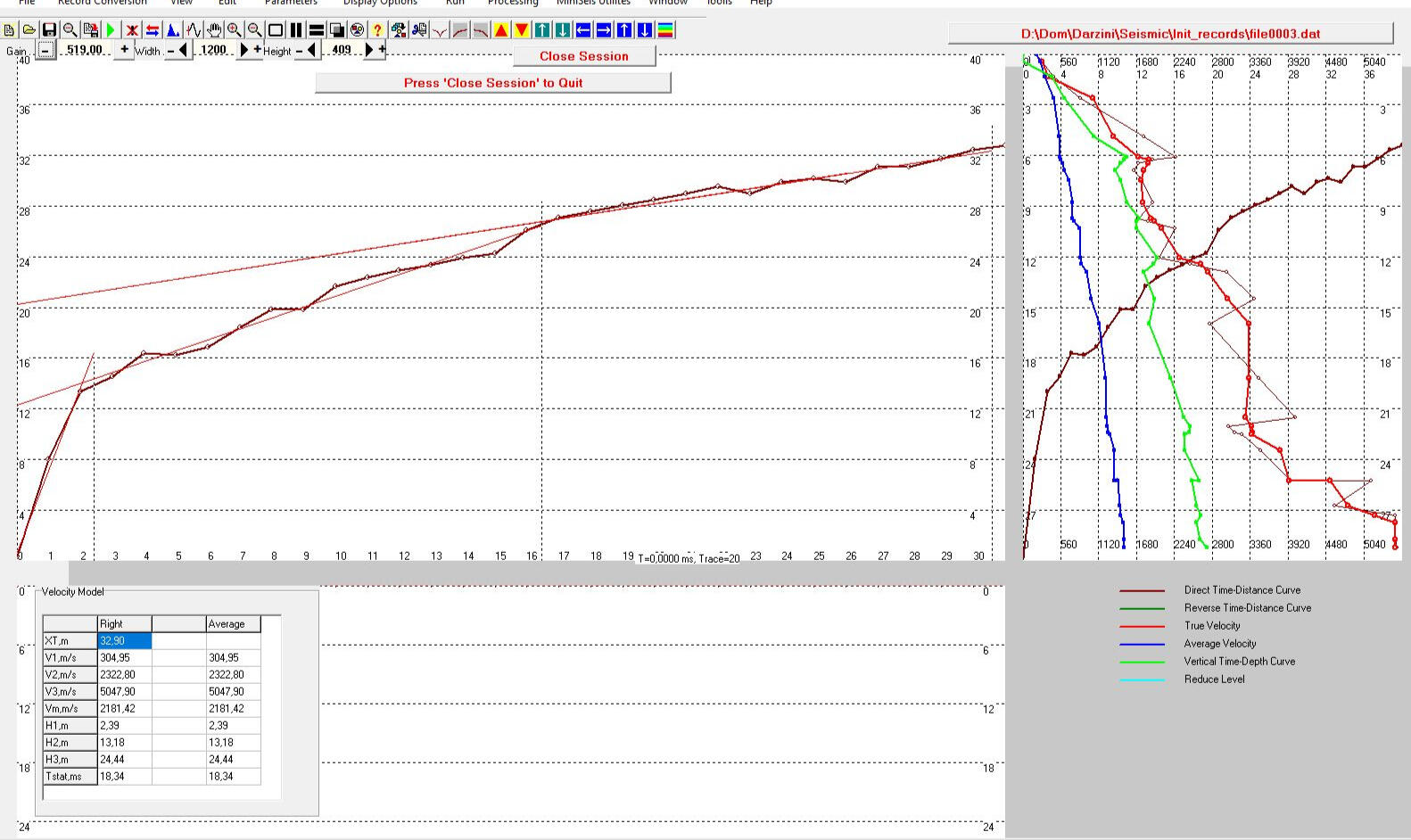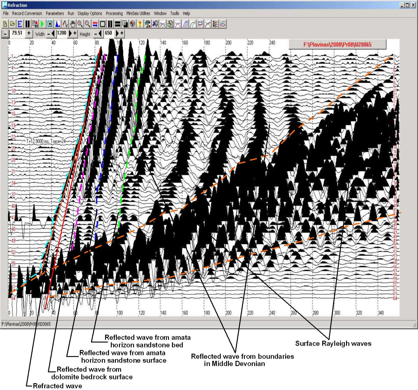 Для определения глубины залегания коренных доломитов использовались разрезы скоростей распространения продольных волн, рассчитанные по данным метода рефрагированных волн. Положение поверхности доломитов в неосушенной части русла шириной порядка 105 м получены по сейсмозаписям с приемной расстановки, расположенной на острове и возбуждении колебаний на берегу.