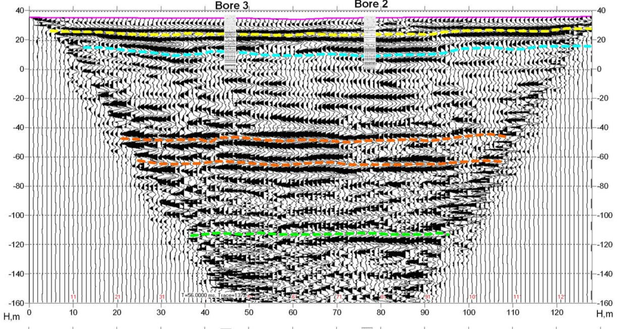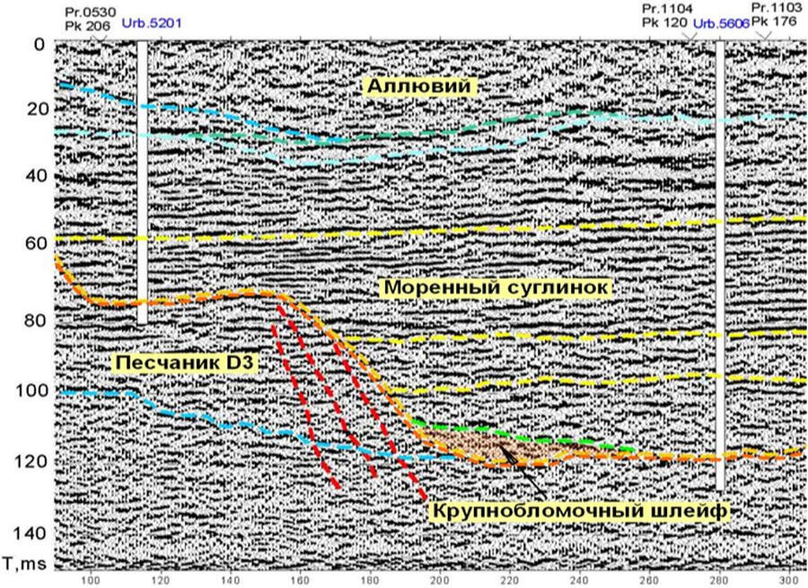 Фрагмент временного разреза ОГТ по профилю через борт погребенной палеодолины. Участок расположения дренажных скважин в нижнем бьефе Плявиньской ГЭС
