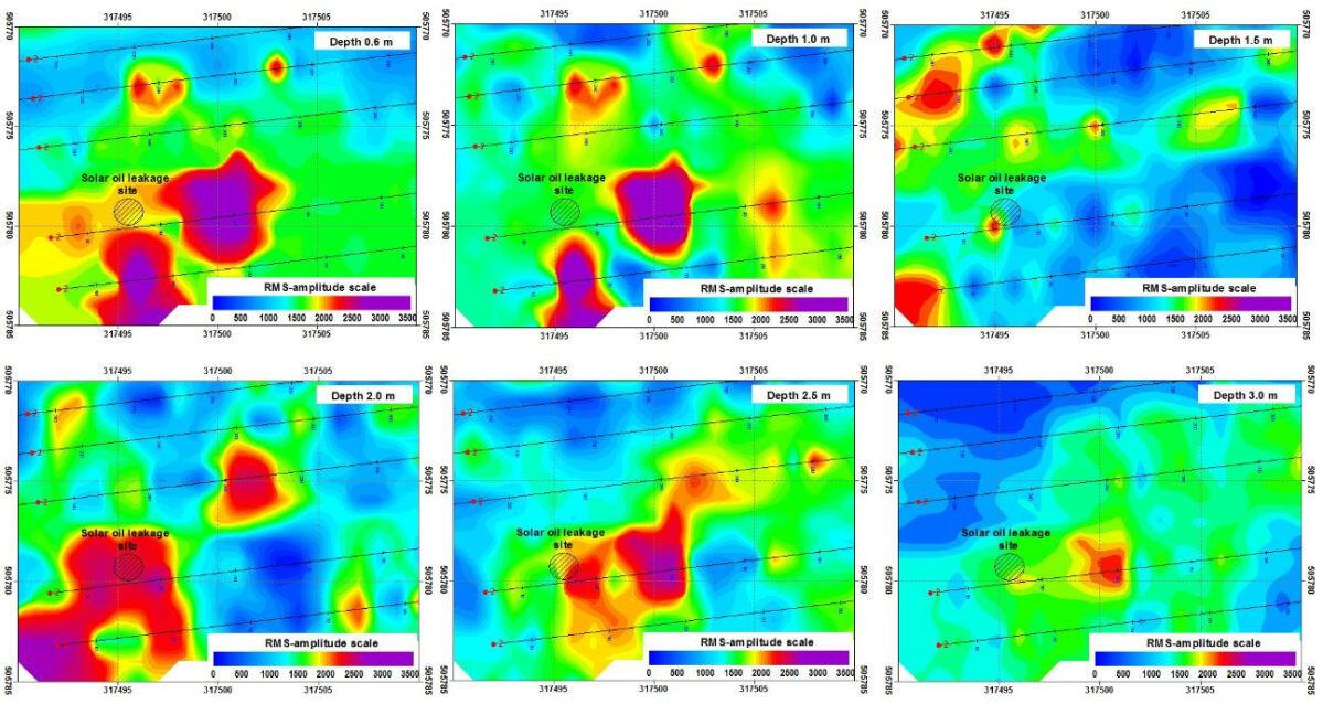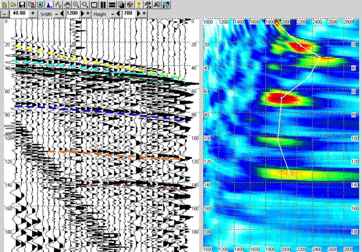 Результатом расчета является двумерная развертка по глубине и по расстоянию вдоль профиля массива (квазиразрез) величин коэффициента поглощения энергии поверхностной волны. Глубина, к которой относится расчетное значение коэффициента поглощения определяется глубиной приуроченности максимума энергии соответствующей частотной составляющей, которая, в свою очередь, зависит от ее фазовой скорости. Поэтому наиболее эффективна совместная интерпретация данных многоканального анализа поверхностных волн (MASW) и расчета частотно-зависимого коэффициента поглощения. Связь коэффициента поглощения со скоростями продольных волн менее существенна, однако и здесь можно наблюдать определенные качественные соответствия характеристик изучаемого разреза по двум независимым методам.