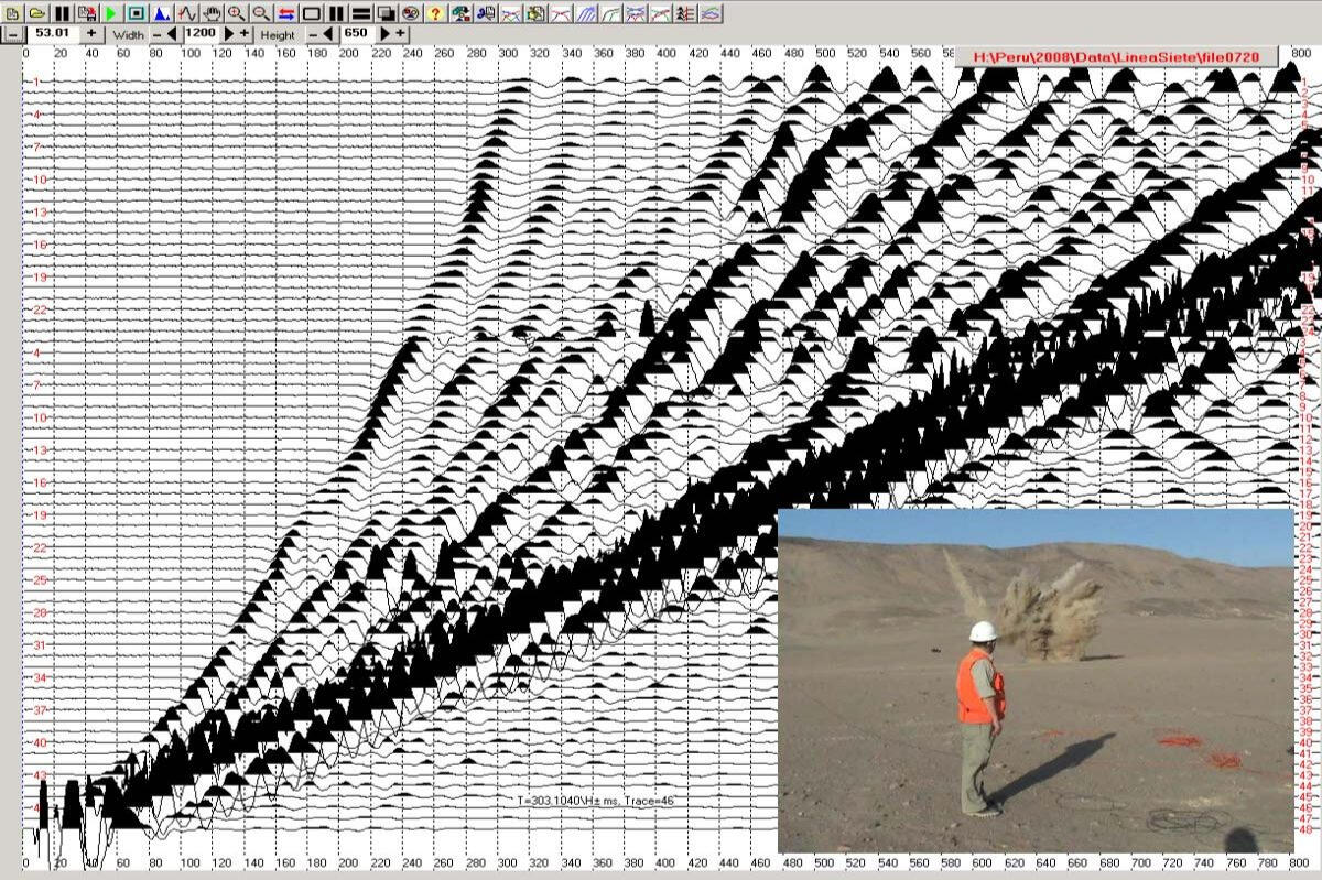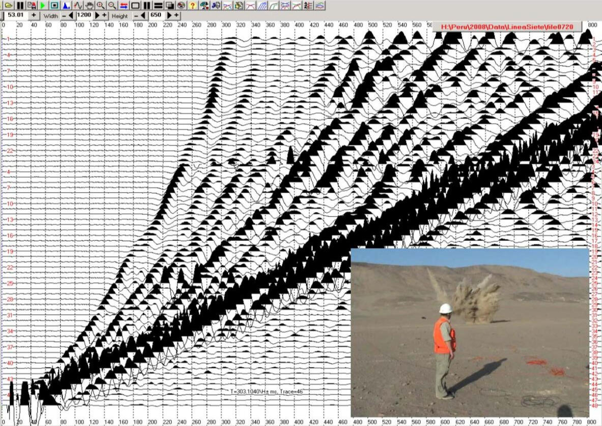 Сейсмограмма рефрагированных волн от взрыва 3 кГ аммонита при базе приема 360 м (участок Choclon-2, Перу)