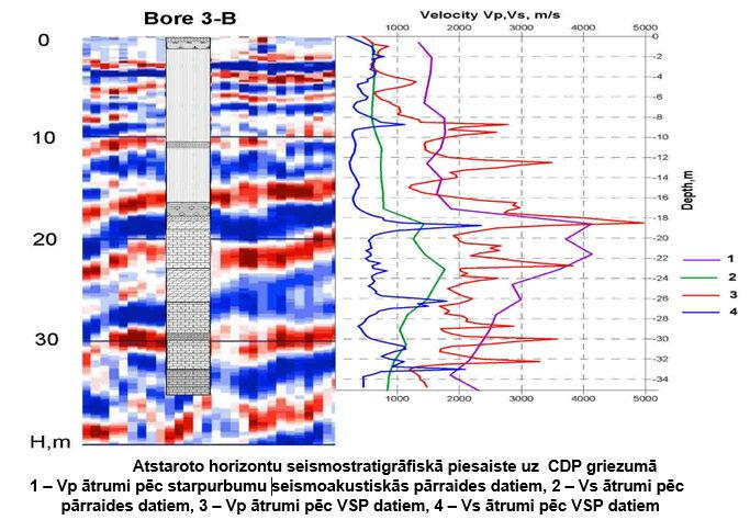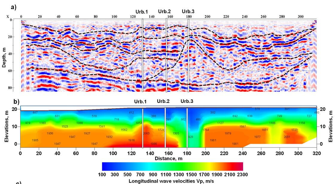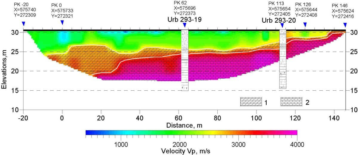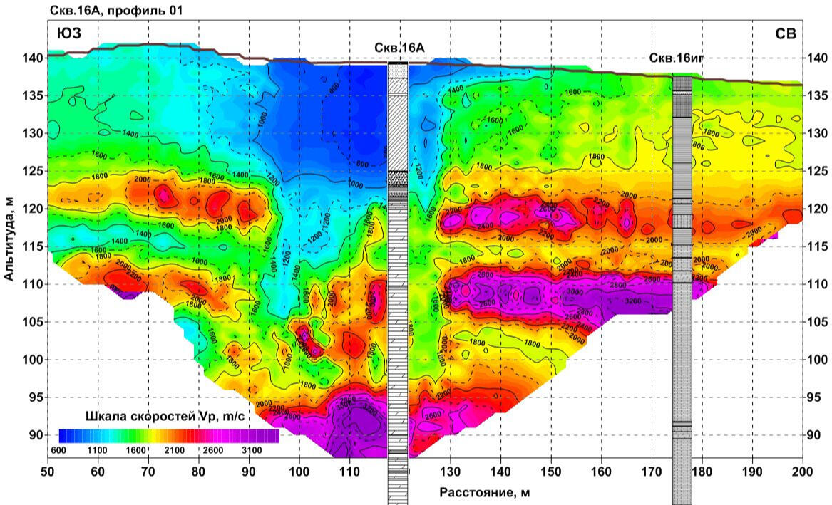 Верхняя часть разреза характеризуется относительно низкими (1200-1500 м/с) значениями скоростей, соответствующих зоне аэрации и водонасыщенных песчано-глинистых грунтов. Отмечаются мелкие линзовидные включения более плотных литологических разностей. Начиная с глубины 95-100 м отмечается резкое увеличение скоростей, соответствующих плотным карбонатно-терригенным породам.