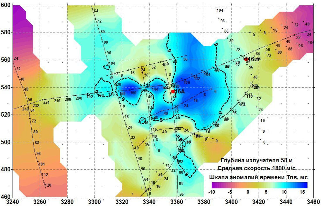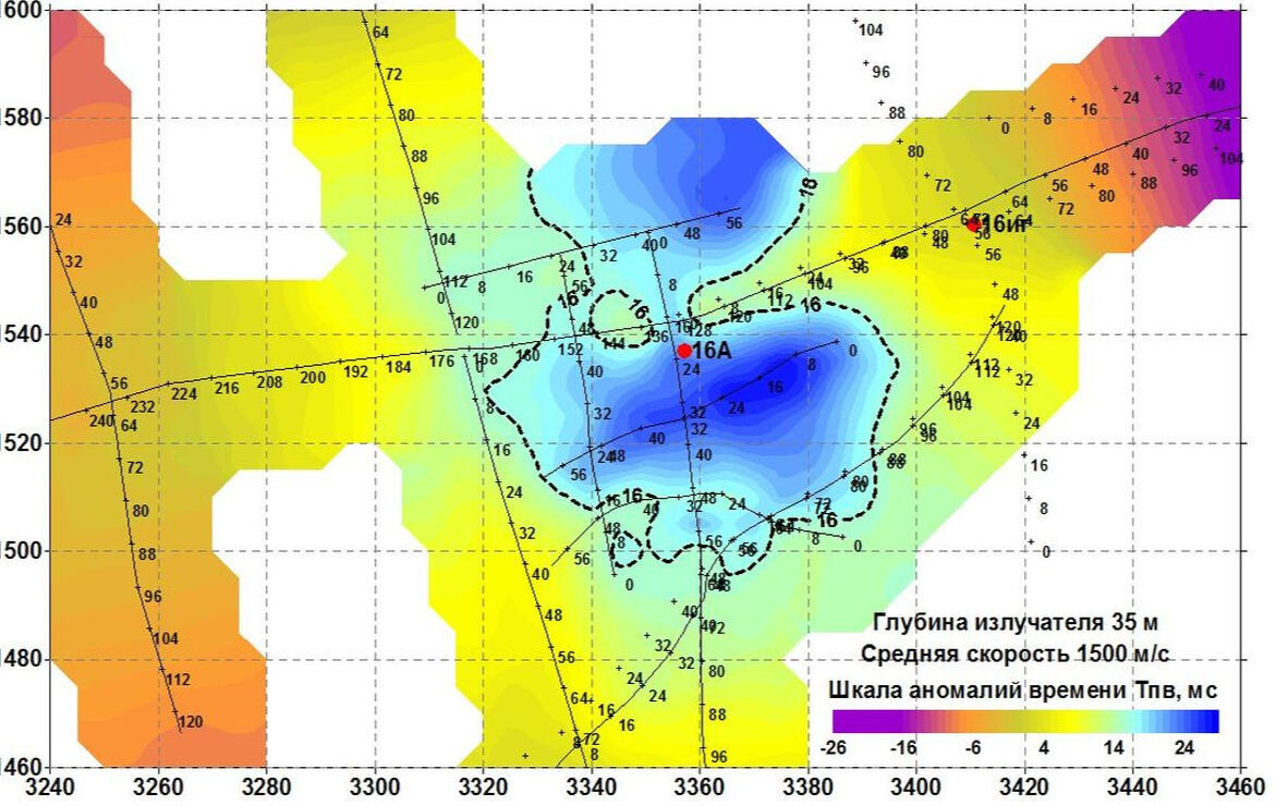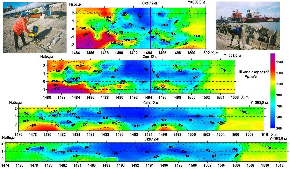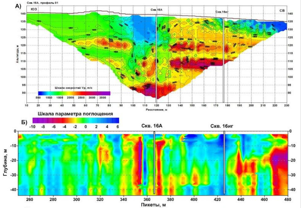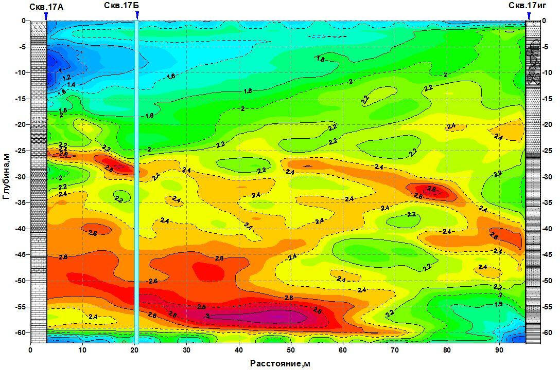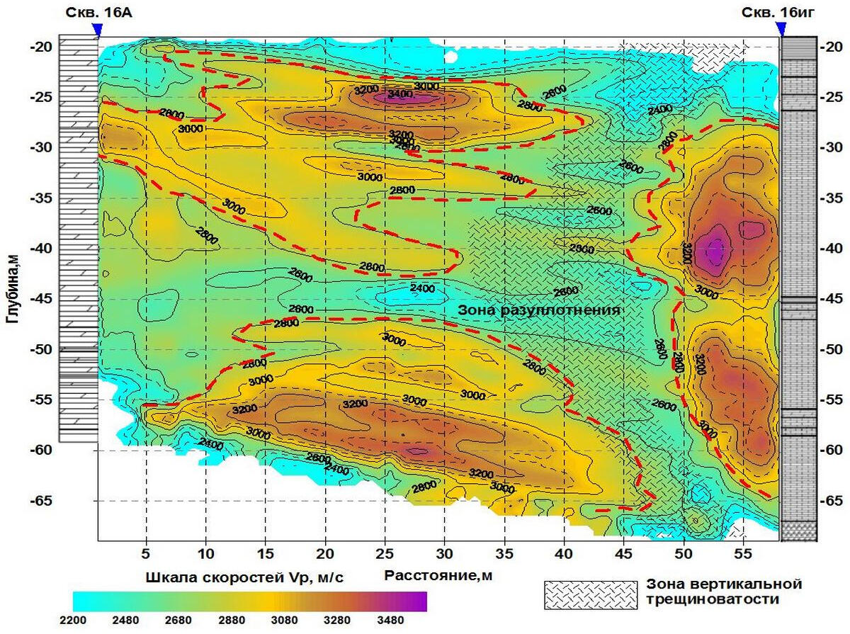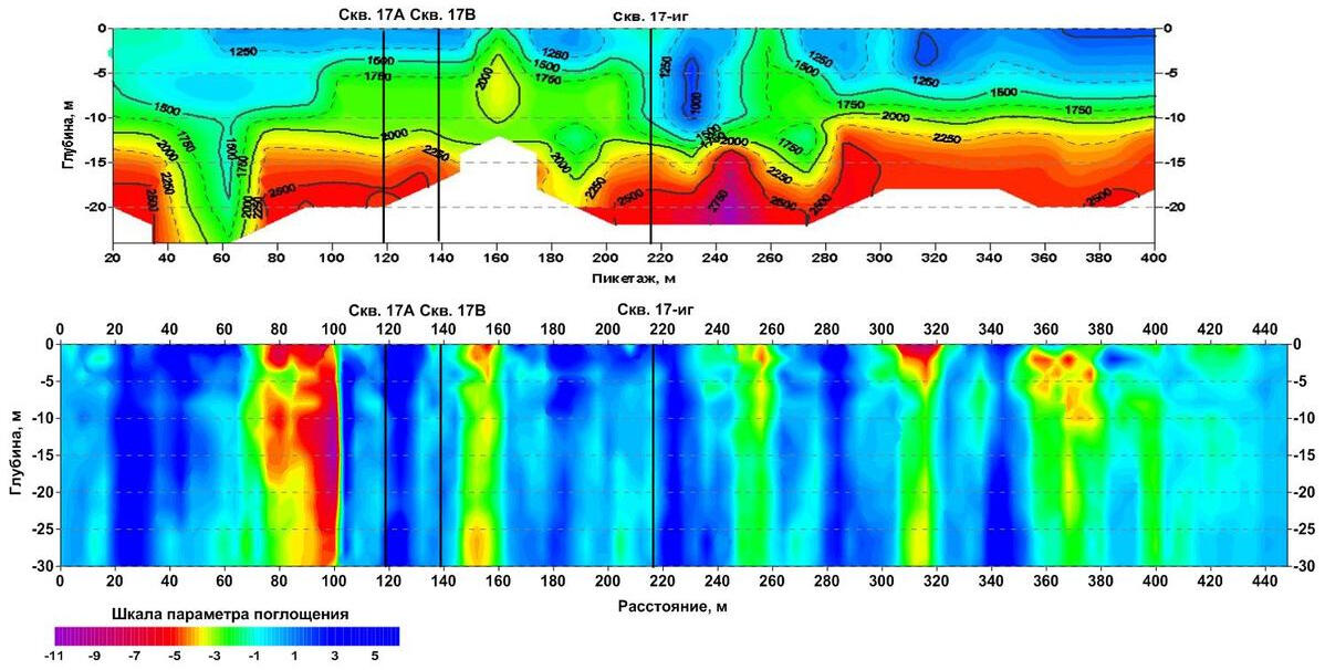 Спустя три года на этом участке пробурены еще две наблюдательные скважины, в которых выполнены исследования методом сейсмоакустического просвечивания. Измерения выполнены с возбуждением импульсов электроискровым источником и приемом сигналов гидрофонами в прямом и обратном направлении между тремя скважинами глубиной 60 м, расположенными на одной линии. Хорошая сходимость результатов просвечивания в прямом и обратном направлении подтверждает общее понижение скоростей распространения упругих волн в районе скважины 17иг (в правой части разреза). Наиболее отчетливо понижение скоростей отмечается в нижней части разреза на глубине более 35 м.В левой части разреза вблизи скважины 17А фиксируется зона низких скоростей в приповерхностной части породного массива, что может указывать на формирование нового участка проседания земной поверхности.