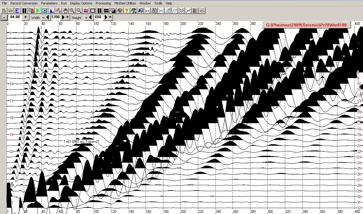 Полевая сейсмограмма поверхностных волн (нижний бьеф плотины Плявиньской ГЭС)
