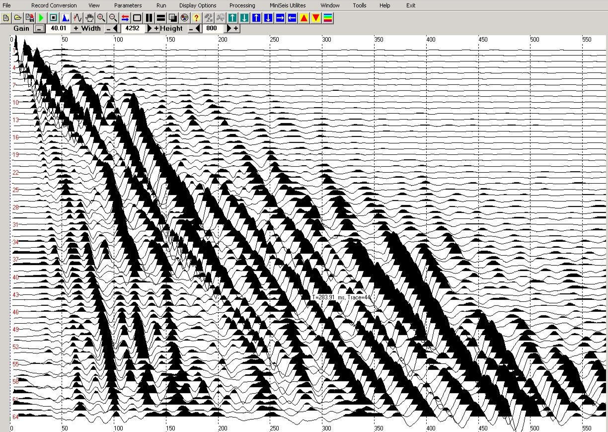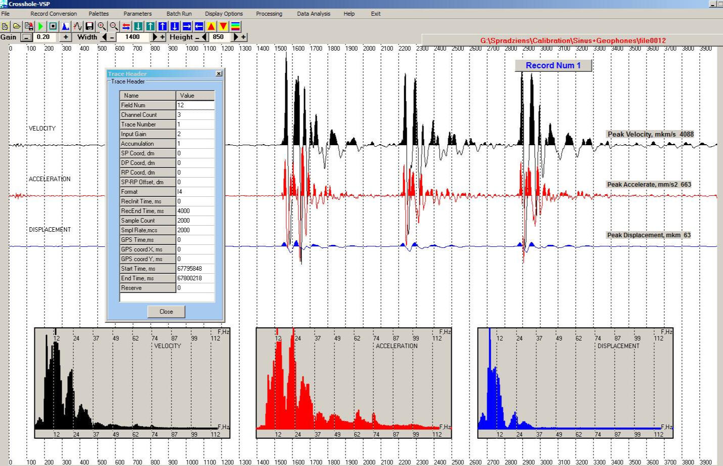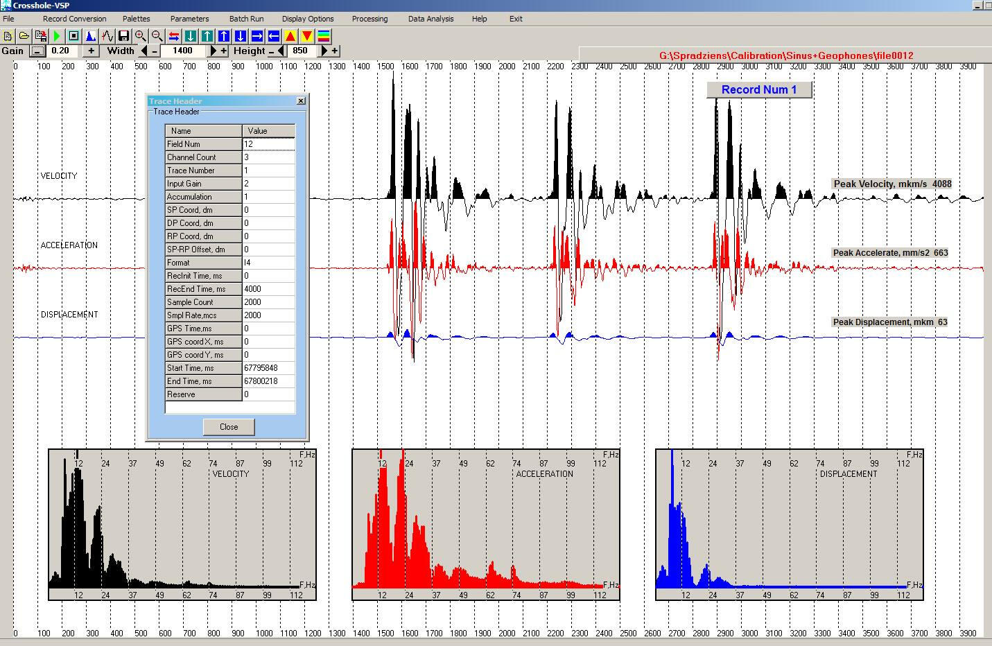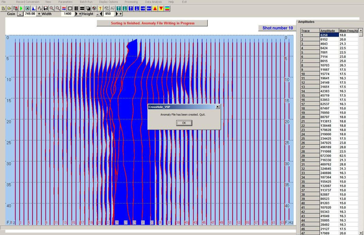 Обработка показанных ниже сейсмозаписей и расчет томографических разрезов выполнены по материалам, полученным отделом активной сейсмоакустики Горного Института УрО РАН (г.Пермь).При использовании электроискрового источника с энергией накопленного заряда порядка 1000 Дж возможна уверенная регистрация сигналов в скважинах на расстояниях до 100 и более метров. При этом за счет затухания высокочастотных составляющих сигнала в грунтах центральная полоса рабочих частот спектра излучаемого сигнала 1000-1600 Гц сужается до 100-400 Гц.