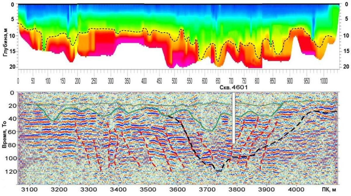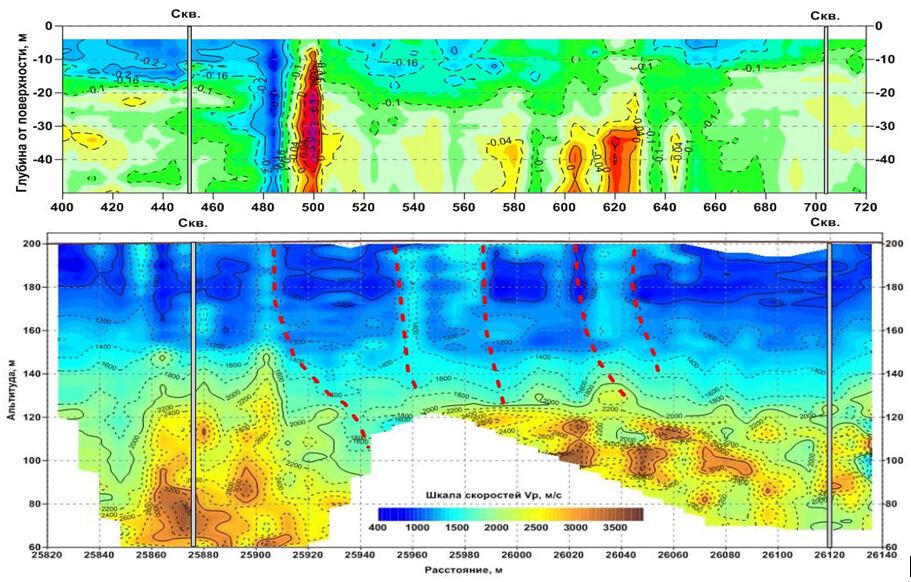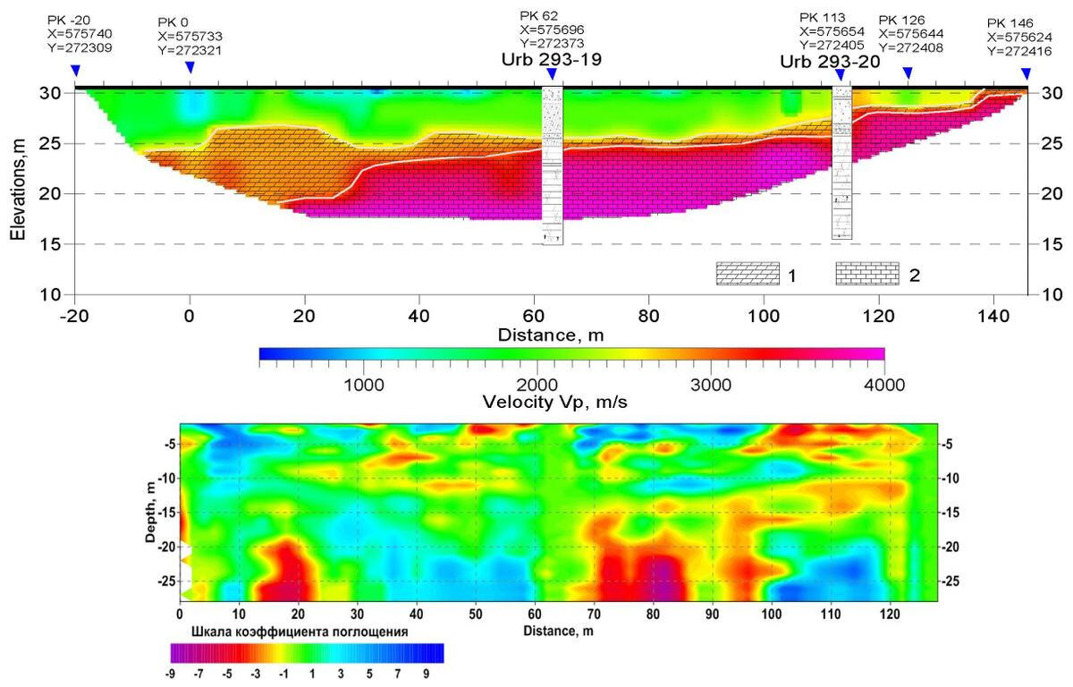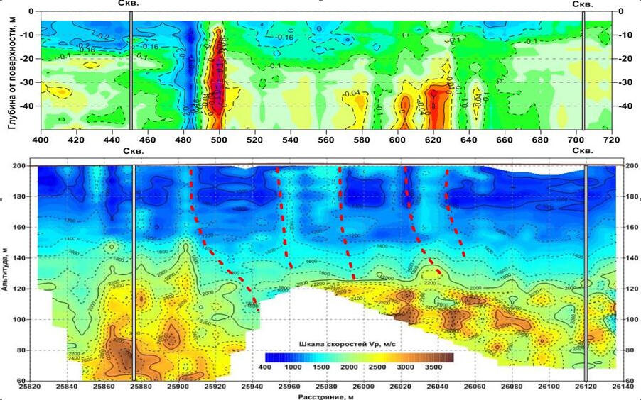 Пример локализации потенциально опасных зон вертикальной трещиноватости в массиве надсоляной толщиВверху – разрез коэффициента затухания энергии поверхностных волн по записям наземной сейсморазведки, внизу – разрез скоростей распространения продольных волн по данным непродольного вертикального сейсмоакустического профилирования в скважинах