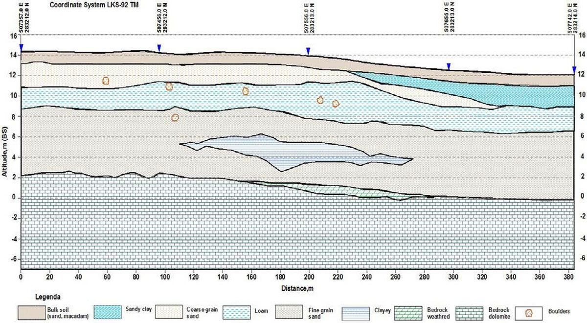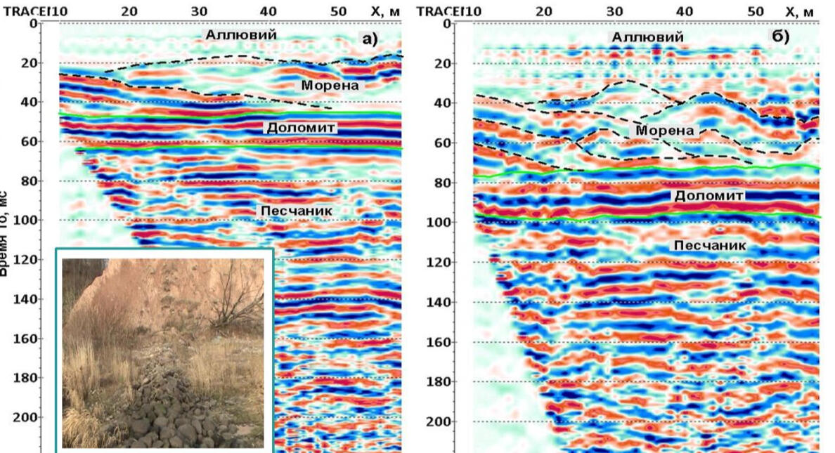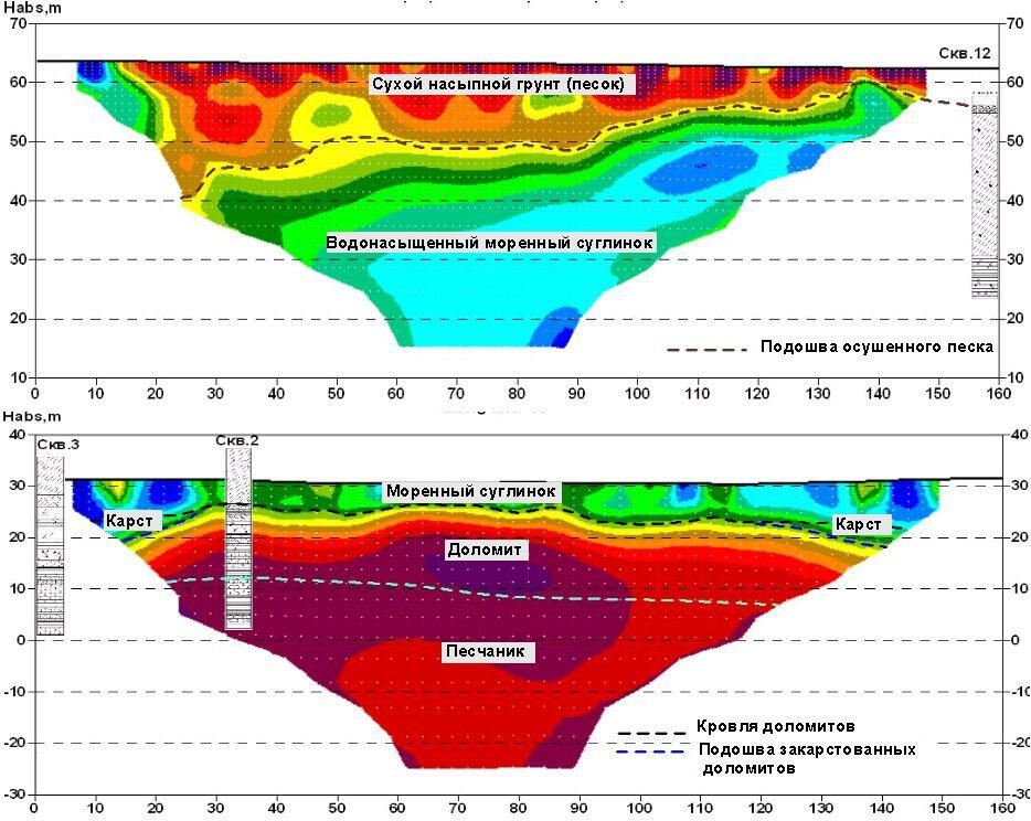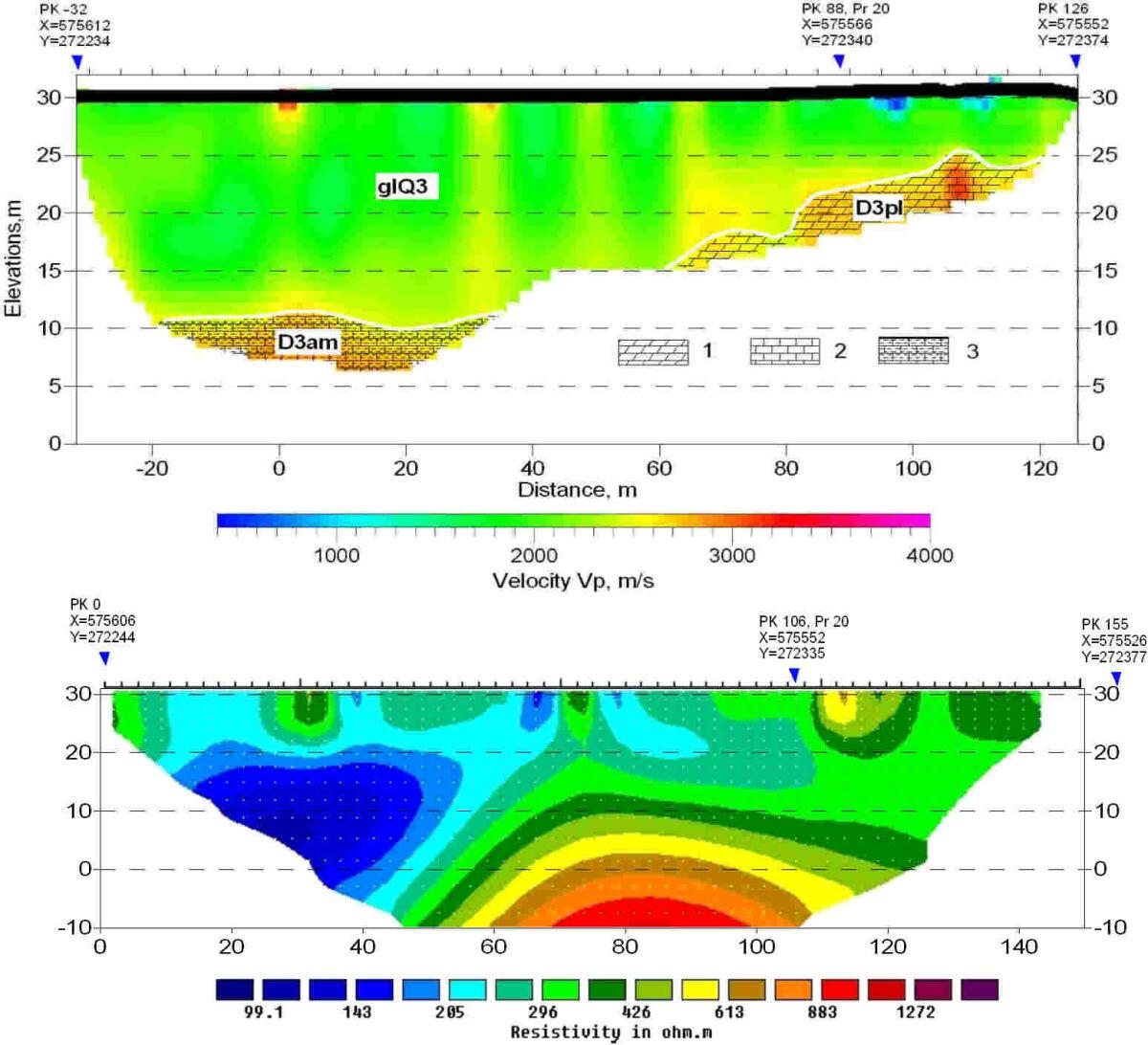 Глубина залегания кровли доломитов в начальной части профиля достигает 20 м. Наиболее углубленная часть долины, заполненная водонасыщенными моренными суглинками отображается также на геоэлектрическом разрезе, полученном методом электротомографии.