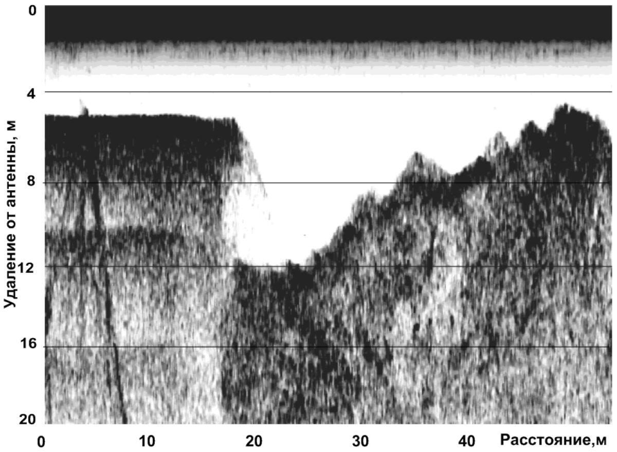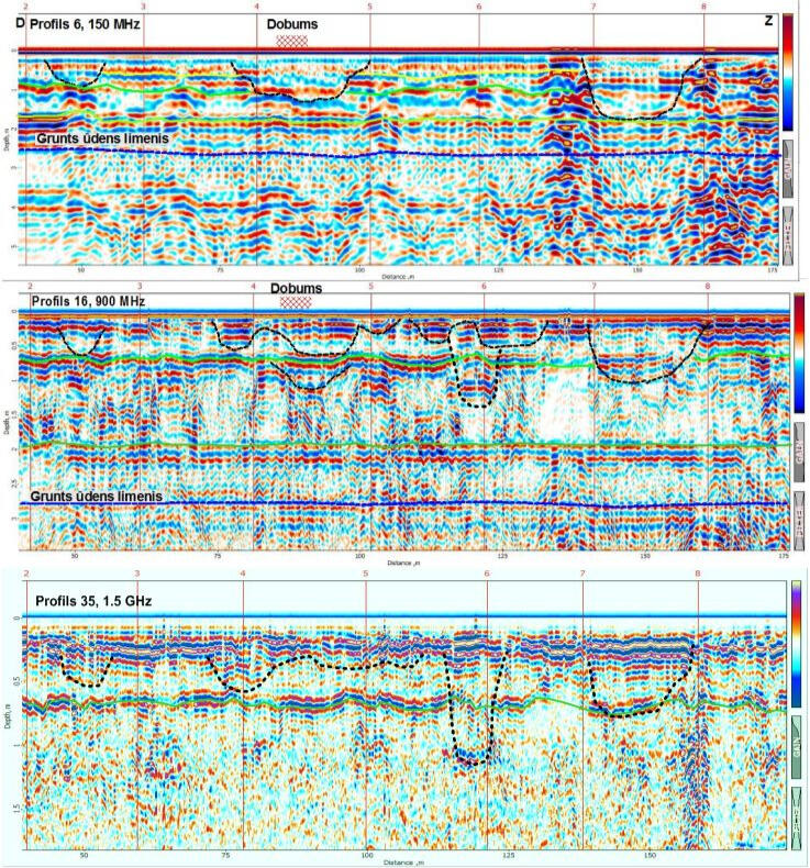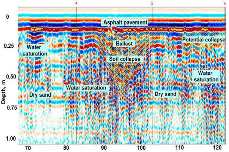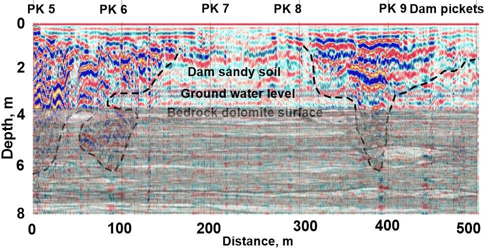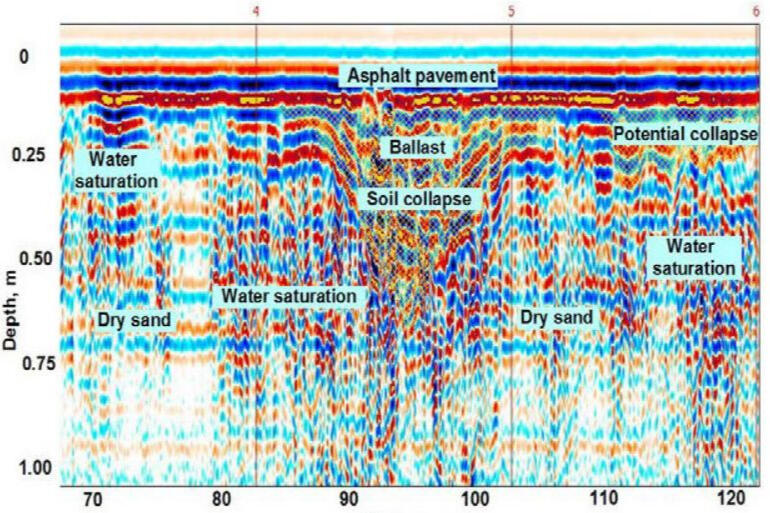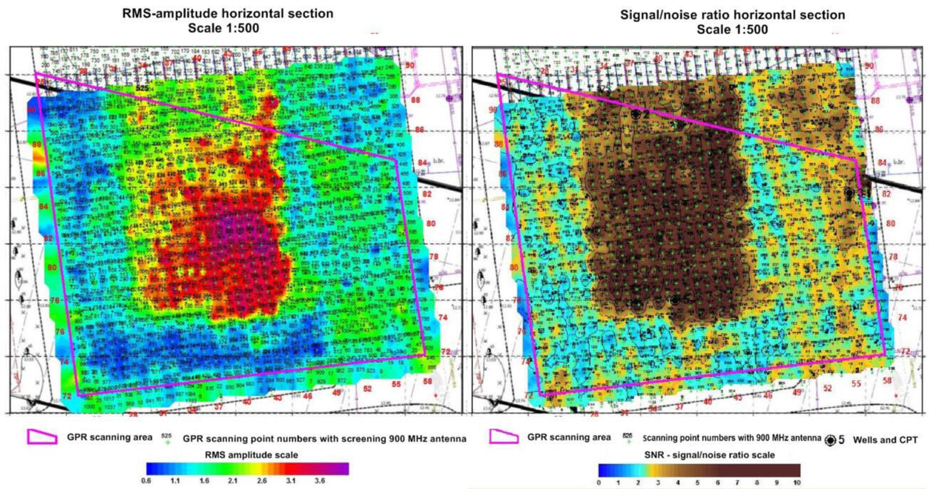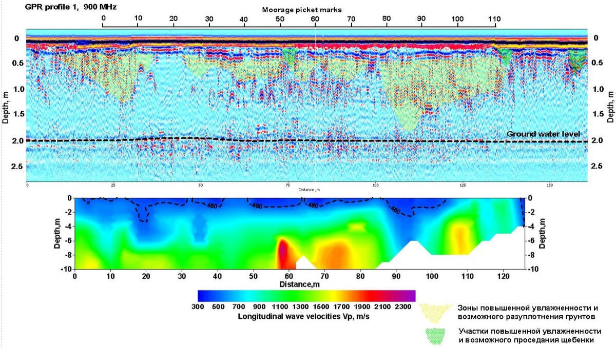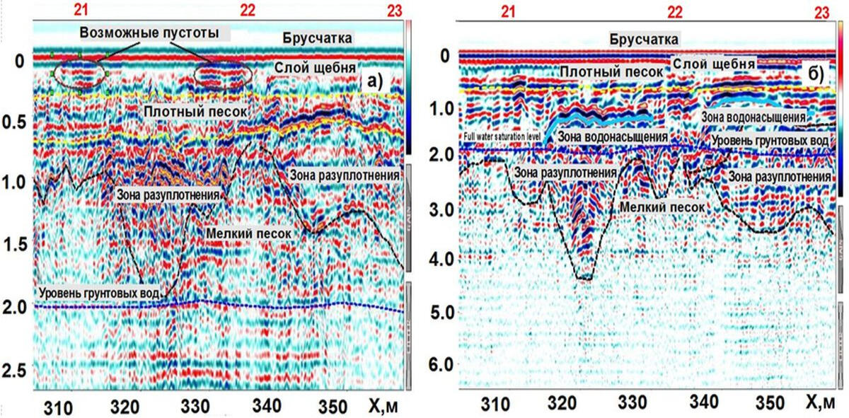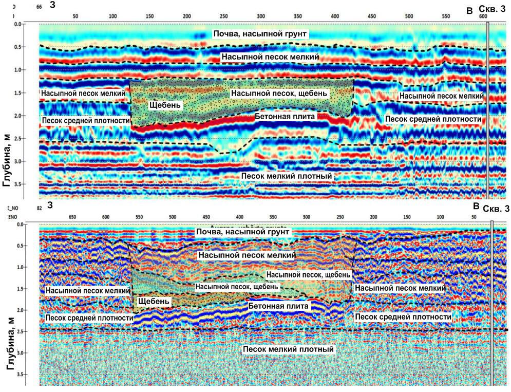 Пример интерпретации данных зондирования массива насыпного грунта показан ниже на рисунке. Под брусчатым покрытием и щебневой отсыпкой прослеживаются участки повышенных амплитуд отражений и затяжки времени их регистрации, связанные с возможными зонами разуплотнения и повышенного водонасыщения в песчаном грунте.Примеры радиолокационных профилей, полученных с использованием экранированной высокочастотной (900 МГц) антенны (слева) и дипольной низкочастотной (150 МГц) антенны (справа) на участке набережной с брусчатым покрытием.Наиболее сильные отражающие границы связаны, вероятнее всего, с поверхностями водонасыщенных линз в песчаном массиве. Из-за скоплений дождевой воды на брусчатке возможно было ее проникновение в приповерхностный слой щебенки и грунта, что существенно изменяет и осложняет волновую картину на записях вследствие резкого изменения диэлектрической проницаемости грунта. Низкочастотное радиолокационное зондирование является весьма эффективным методом для картирования поверхности грунтовых вод в песчаных отложениях
