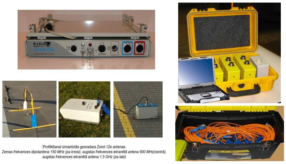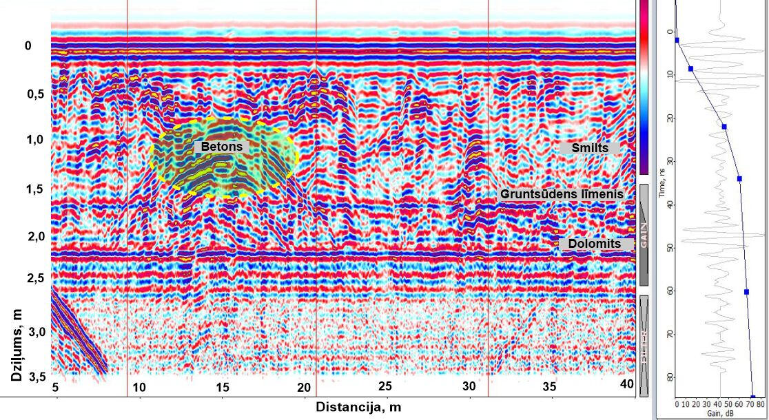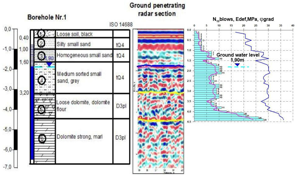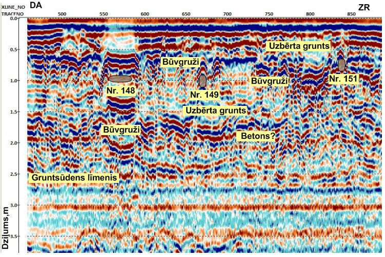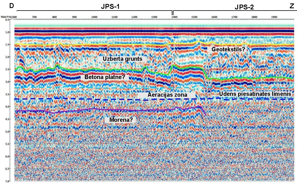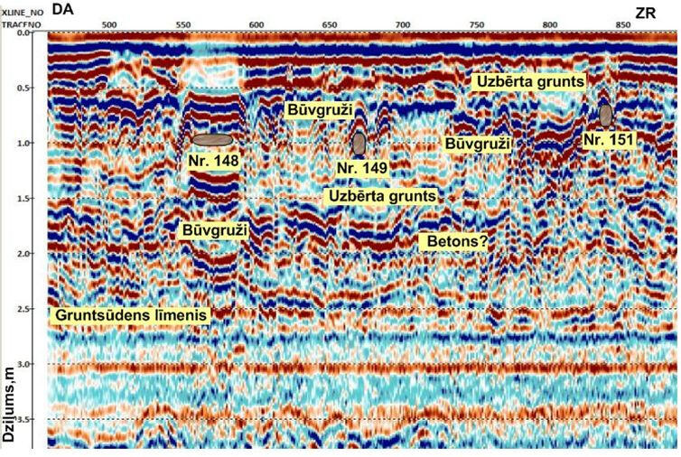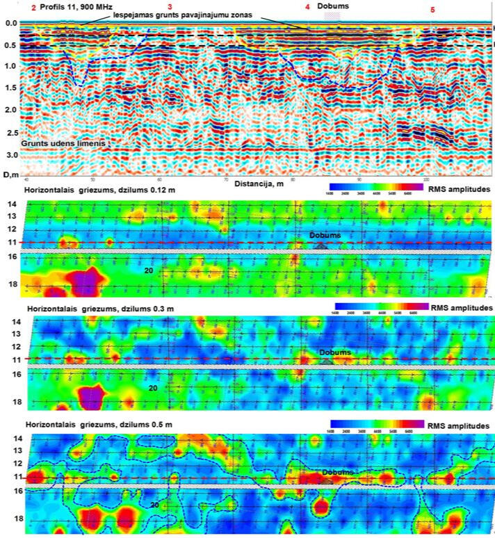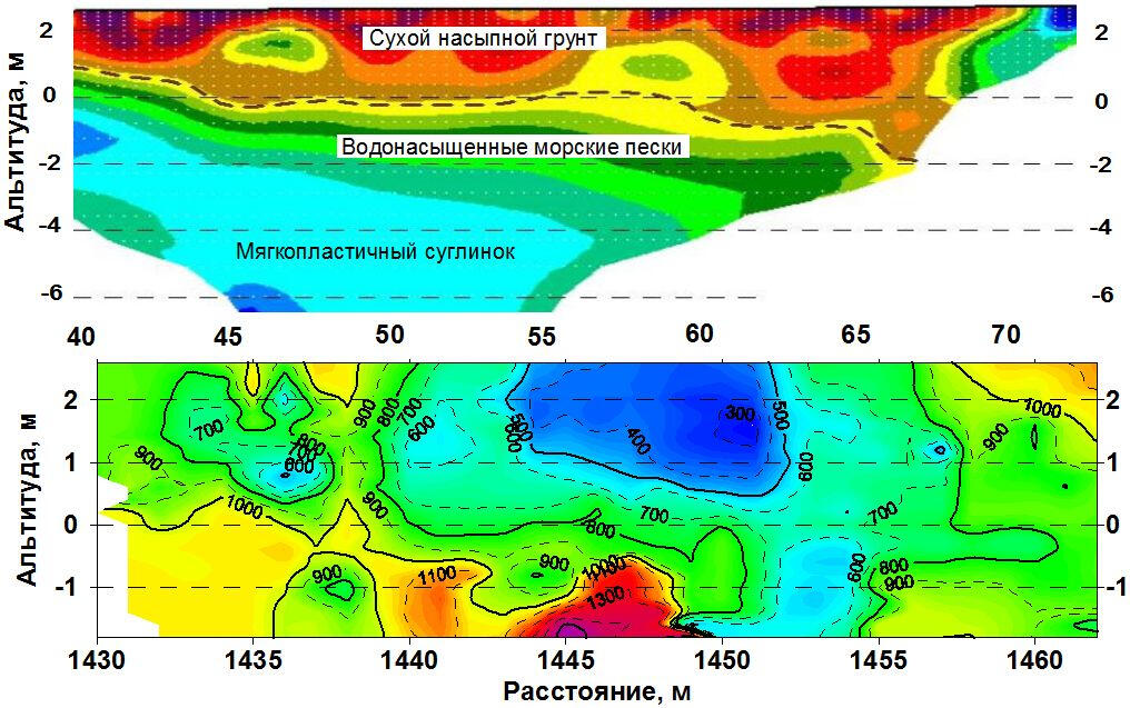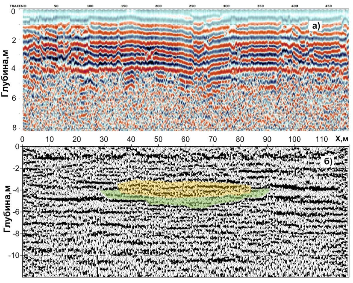 Пример интерпретации данных зондирования массива насыпного грунта показан ниже на рисунке. Под брусчатым покрытием и щебневой отсыпкой прослеживаются участки повышенных амплитуд отражений и затяжки времени их регистрации, связанные с возможными зонами разуплотнения и повышенного водонасыщения в песчаном грунте.Примеры радиолокационных профилей, полученных с использованием экранированной высокочастотной (900 МГц) антенны (слева) и дипольной низкочастотной (150 МГц) антенны (справа) на участке набережной с брусчатым покрытием.Наиболее сильные отражающие границы связаны, вероятнее всего, с поверхностями водонасыщенных линз в песчаном массиве. Из-за скоплений дождевой воды на брусчатке возможно было ее проникновение в приповерхностный слой щебенки и грунта, что существенно изменяет и осложняет волновую картину на записях вследствие резкого изменения диэлектрической проницаемости грунта. Низкочастотное радиолокационное зондирование является весьма эффективным методом для картирования поверхности грунтовых вод в песчаных отложениях