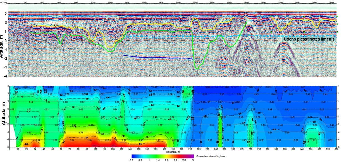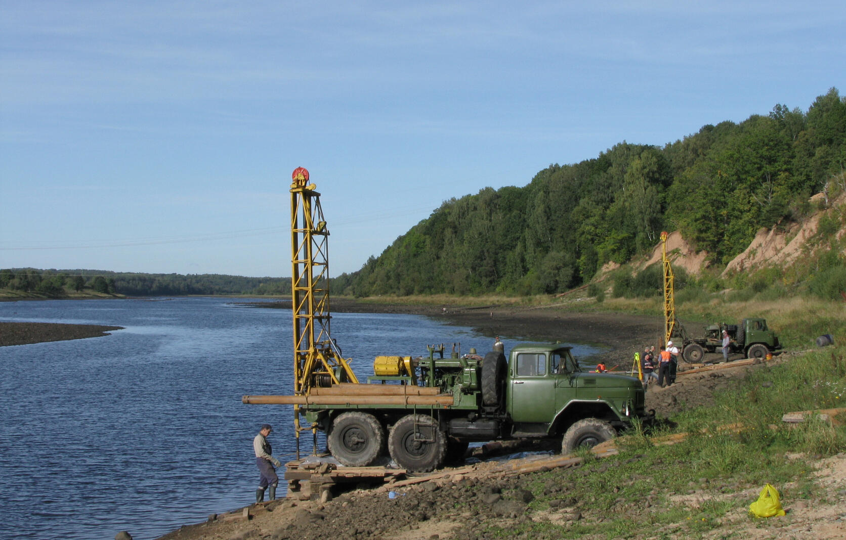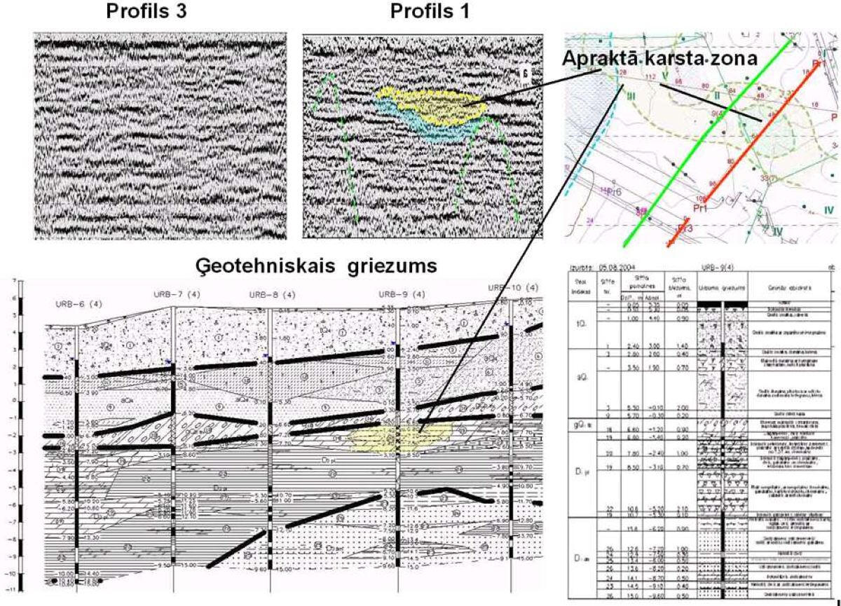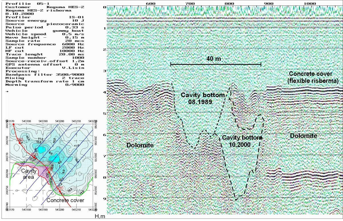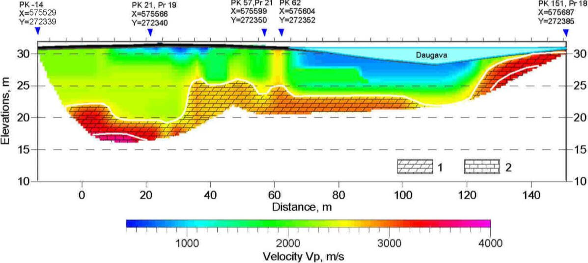 Работы методами инженерной сейсморазведки и электротомографии выполнены на недоступном для бурения островном участке в центральной части русла реки, осушенного при остановке работы гидроэлектростанции и сработке уровня расположенного ниже по каскаду водохранилища Кегумской ГЭС.Основной задачей работ было определение контуров бортов переуглубленной доледниковой долины р.Даугава, прорезающей в месте строительства плотины Плявиньской ГЭС коренные доломиты плявиньской свиты верхнего девона. Крутые борта долины, вдоль которых проявляются оползневые и карстовые процессы и повышенная скорость фильтрации подземных вод, являются неблагоприятными для устройства тяжелых бетонных фундаментов и стен водобойного колодца.