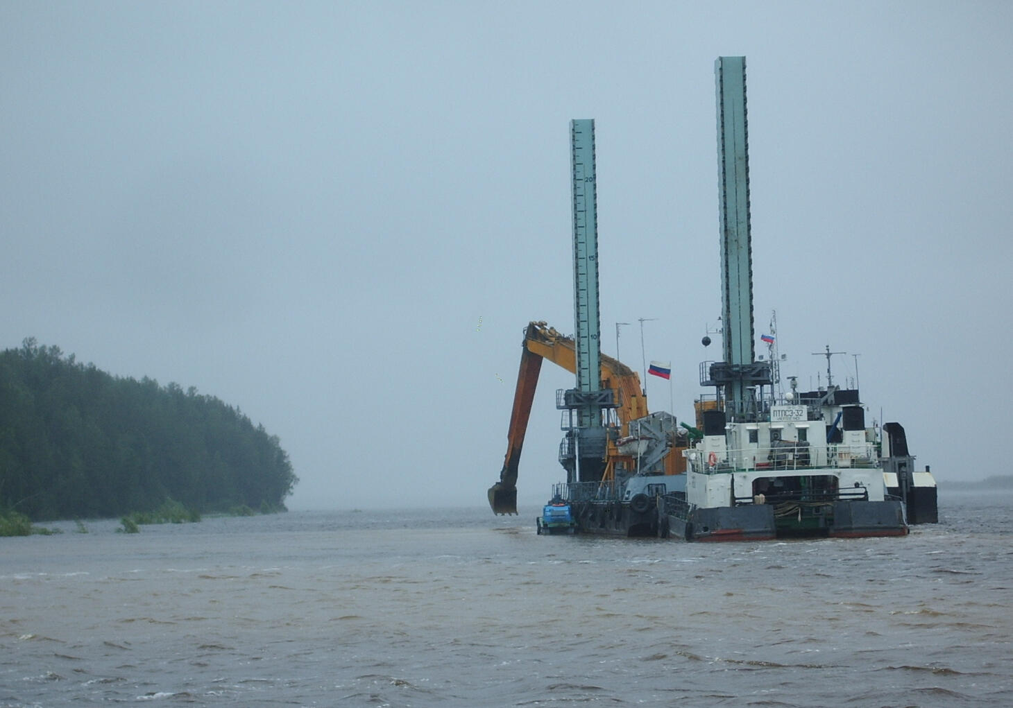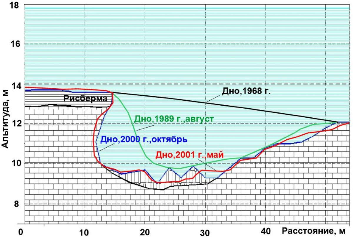 По параметру скорости поперечных волн выше глубины 8 м в интервале ПК 30-ПК-40 выделяется широкая аномалия пониженных скоростей, что, вероятно, связано с вымыванием мелкодисперсной фракции накопившегося песка и ее выносом в реку. Эта аномалия заслуживает особого внимания, поскольку расположена рядом с районом ликвидированного обвала пирса.