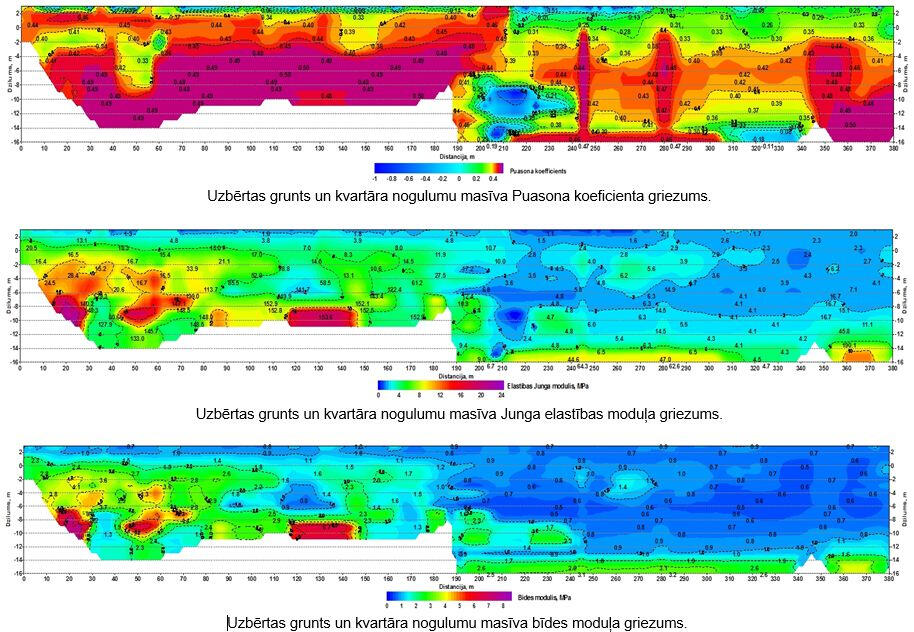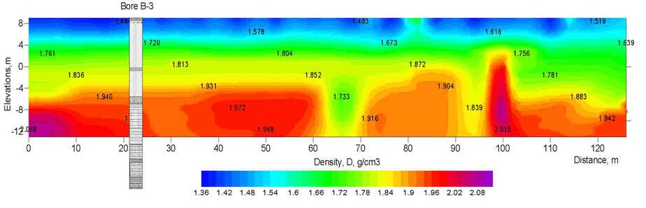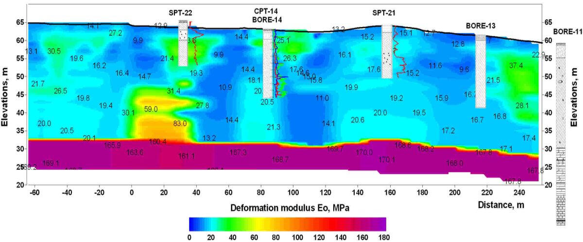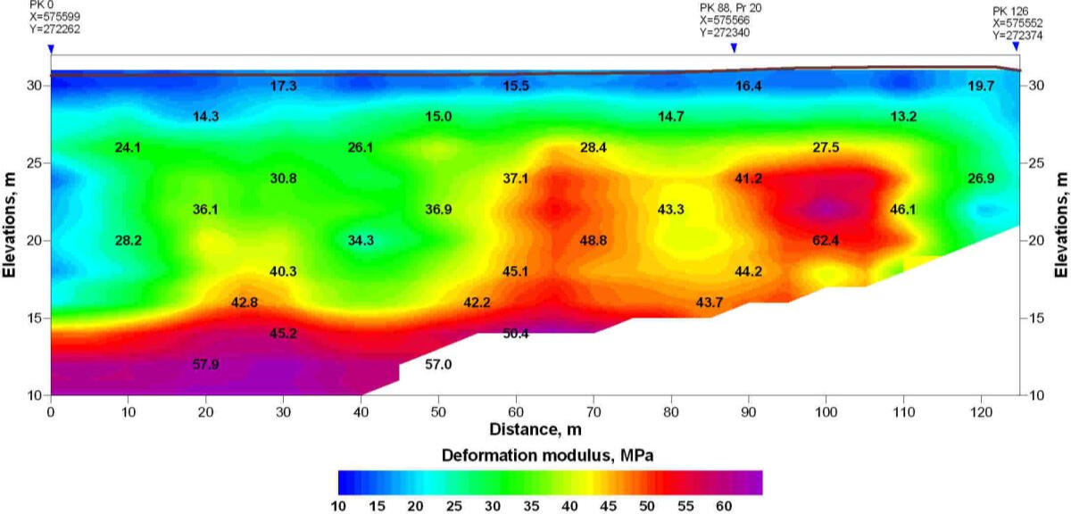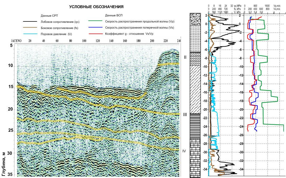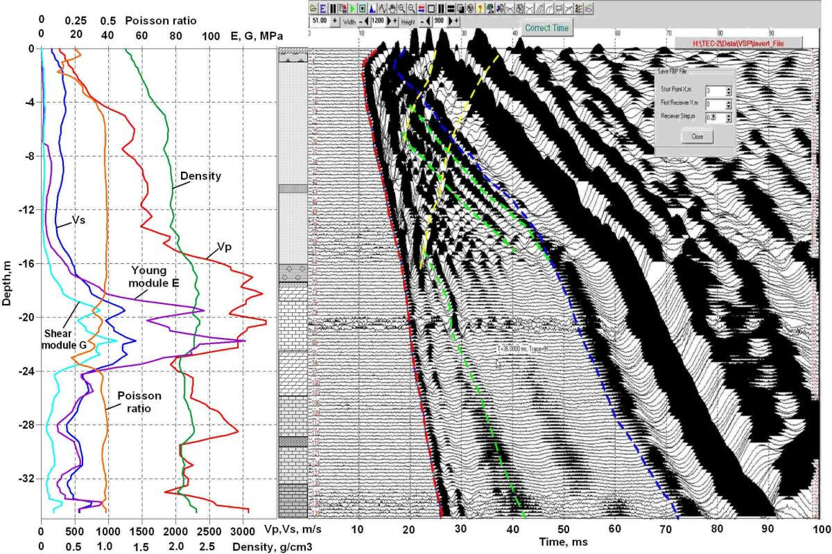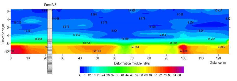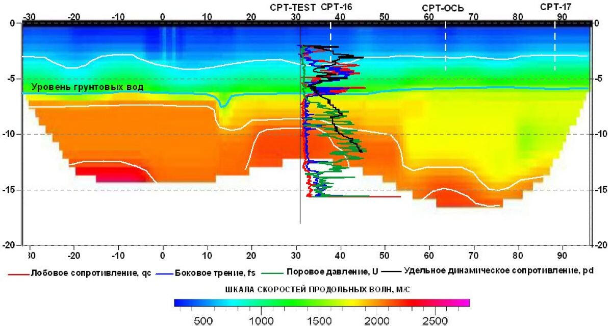 По скоростям распространения продольных и поперечных волн выполнялись прямые расчеты упругих констант грунтового массива - модуля упругости Юнга, модуля сдвига и коэффициента Пуассона. Прогнозные физико-механические параметры - плотность грунта, модуль общей деформации, угол внутреннего трения и удельное сцепление, рассчитывались с использованием известных эмпирических корреляционных зависимостей для определенных типов грунтов, скорректированных путем совместной обработки данных сейсморазведки и статического зондирования на участке исследований.