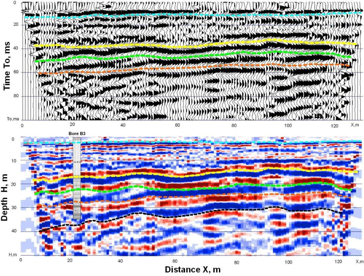 Разрез мини-ОГТ, инвертированный в глубинный масштаб, по профилю через второстепенный рукав-протоку погребенной палеодолины. Участок верхнего бьефа Плявиньской ГЭС