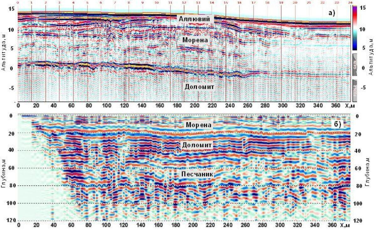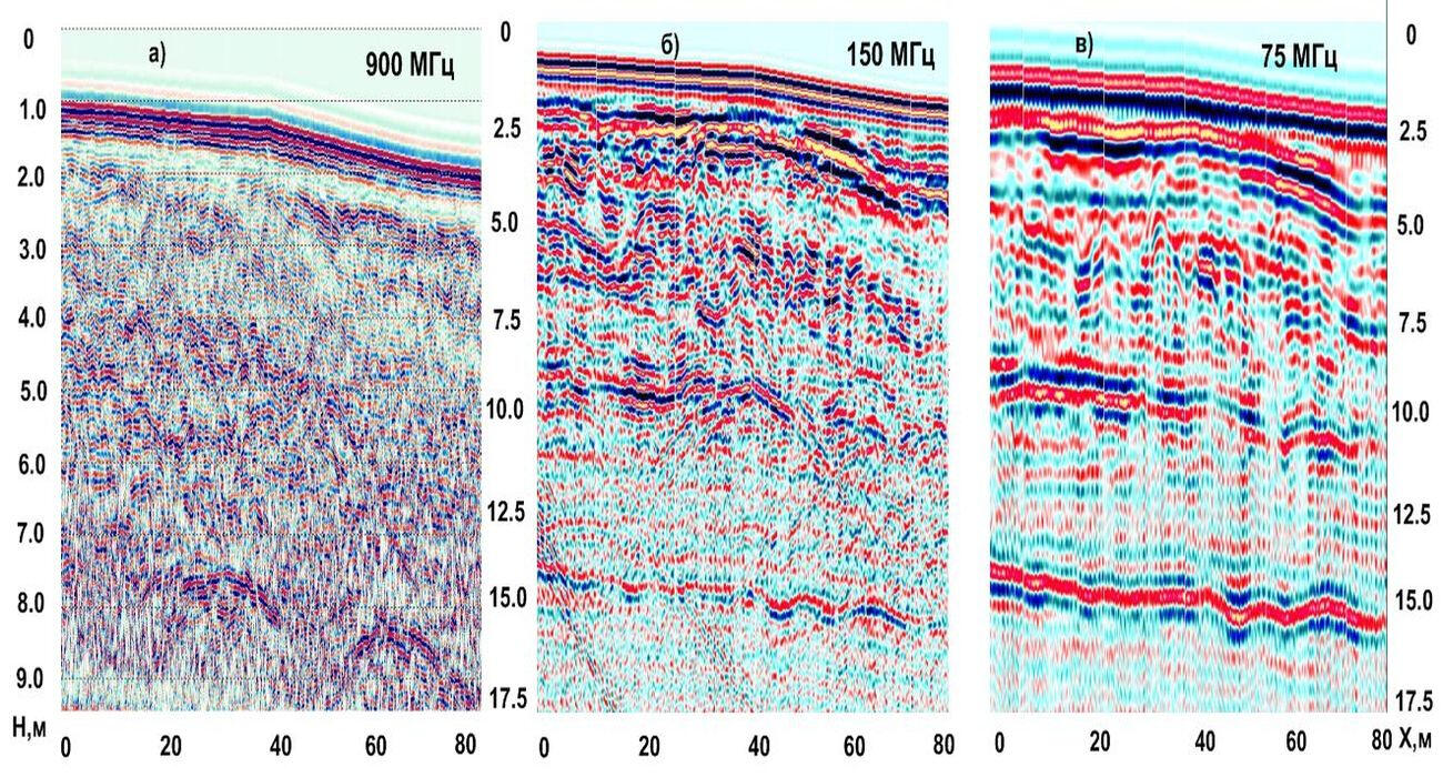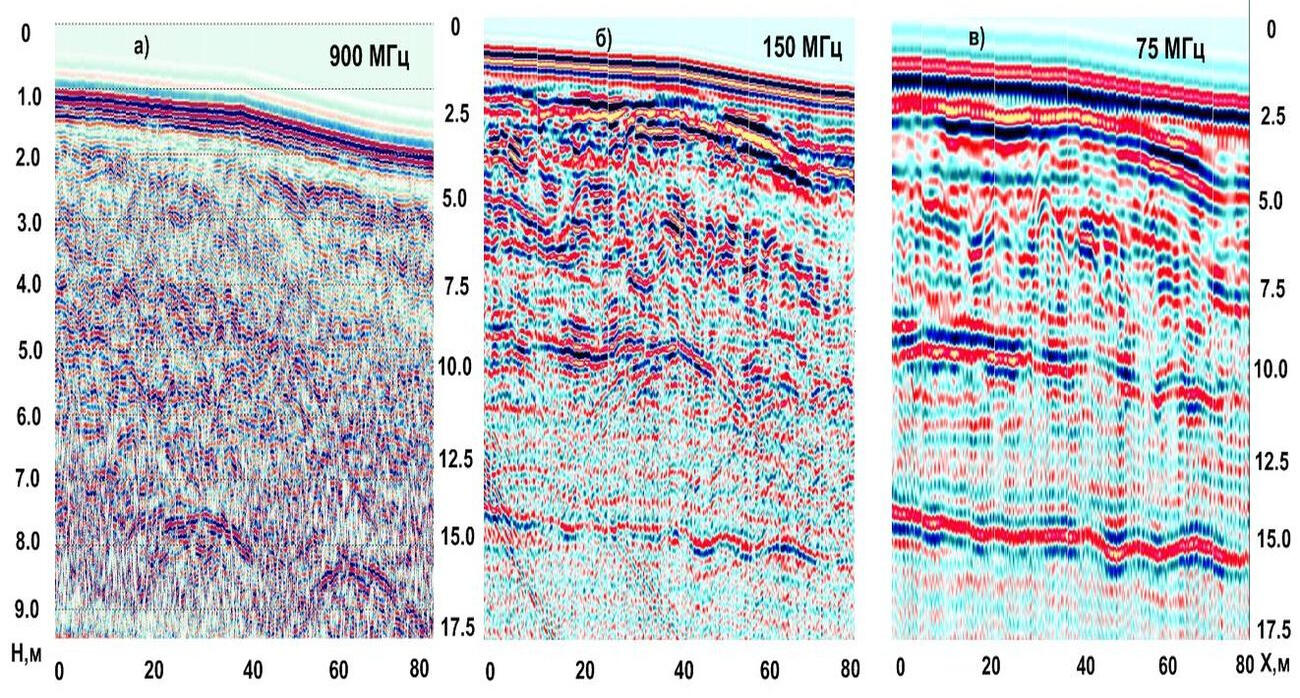 В моренных и аллювиальных отложениях применение георадиолокационного метода весьма эффективно для изучения строения верхней части массива рыхлых песчаных грунтов и поверхности коренных пород. При глубоком залегании уровня грунтовых вод использование дипольных низкочастотных антенн позволяет достичь глубинности 15-20 м, проследить границы слоев грунтового массива и особенности поверхности коренных пород. На рисунке показаны примеры радиолокационных разрезов (75-150-900 Мгц), детально отображающих строение моренных грунтов над поверхностью коренных пород, и являющихся эффективным дополнением к сейсмическому методу отраженных волн. Возможности иcпользования в комплексе высокочастотной экранированной антенны 900 МГц для этих целей существенно ограничены, поскольку глубина проникновения импульса не превышает обычно 3-4 м даже в сухих песчаных грунтах.