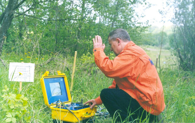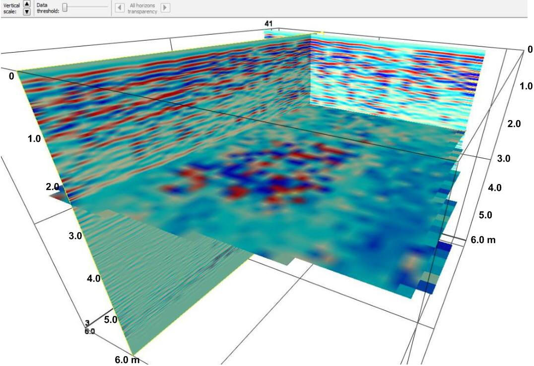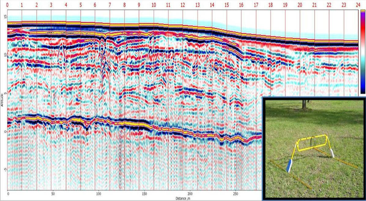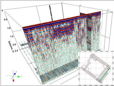 - радиолокационное зондирование подповерхностных слоев с использованием двух типов приемно-излучающих антенн с рабочей частотой излучаемого импульса 150 МГц и 900 МГц по четырем профилям длиной 160 м;