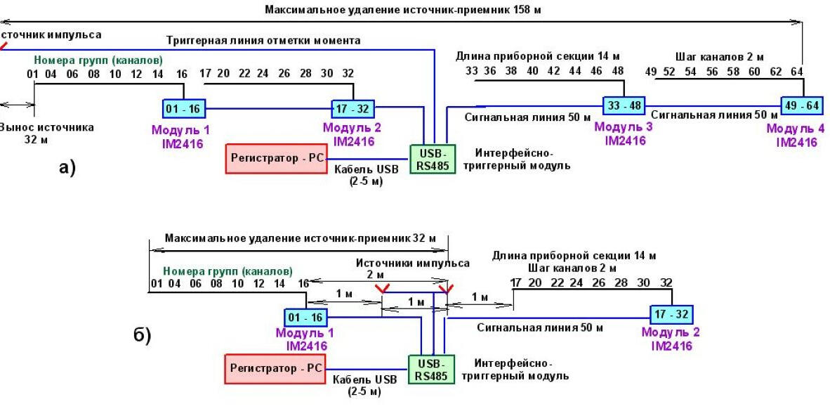 Прием колебаний ведется многоканальным (8-24 канала) пьезогидрофонным зондом в наблюдательной скважине. Требования к оборудованию наблюдательных скважин в этом случае остаются теми же, что и при измерениях по стандарту ASTM D 4428/D. При невозможности использования для обсадки полиэтиленовых труб и частичной замене их стальными в верхних обваливающихся интервалах грунтового массива наблюдения проводятся в интервалах открытых стволов скважин до уровня заполнения их водой. Более мощный излучатель электроискрового типа (спаркер) с энергией разряда порядка 1-1,5 кДж перемещается с заданным шагом по стволу соседней скважины, как правило на всю длину исследуемого интервала. При необходимости просвечивания интервала геологического разреза, превышающего длину приемного зонда, зонд перемещается по стволу наблюдательной скважины на новую позицию, и серия возбуждений импульса с перемещением источника по скважине повторяется.