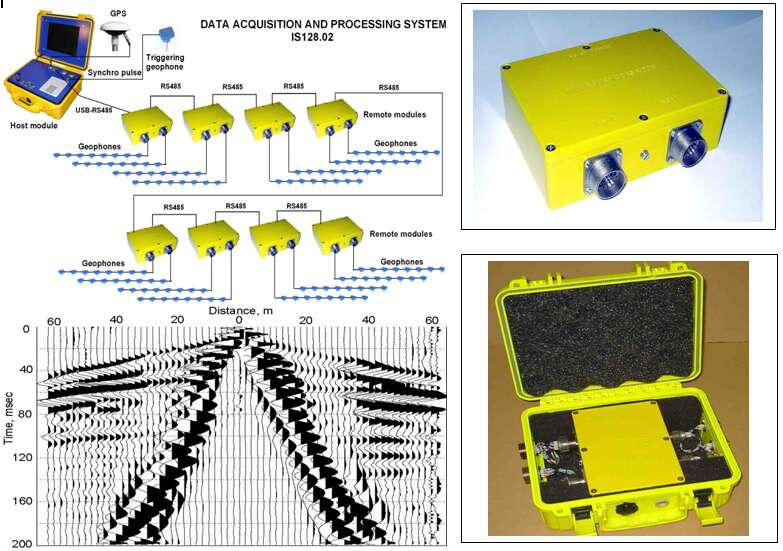 Вертикальное сейсмоакустическое профилирование (ВСП) в неглубоких геотехнических скважинах применяется для решения различных задач - получения статических поправок за зону малых скоростей при проведении конвенционной сейсморазведки на нефть и газ, для привязки отражений на разрезах малоглубинной сейсморазведки ОГТ, для получения детальных разрезов упругих модулей и прогнозных оценок прочностных и деформационных свойств грунтов.Обычно для приема колебаний используется пьезоприемный многоканальный (8-24 канала) пьезозонд. Работы выполняются с импульсным ударным источником (кувалда). При низком уровне грунтовых вод скважина обсаживается колонной полиэтиленовых труб диаметром 100-105 мм с обратным клапаном в нижней части колонны. В этом случае скважина может быть заполнена водой до поверхности, защищена от обвалов и использована для повторных наблюдений. Удаление источника от устья скважины 3-6 м. Ориентировочные параметры записей: дискретность отсчетов 100-200 мкс, число отсчетов 1000-2000, длительность записи 100-400 мс. Традиционно расстояние между каналами в гидрофонном зонде 1 м.
