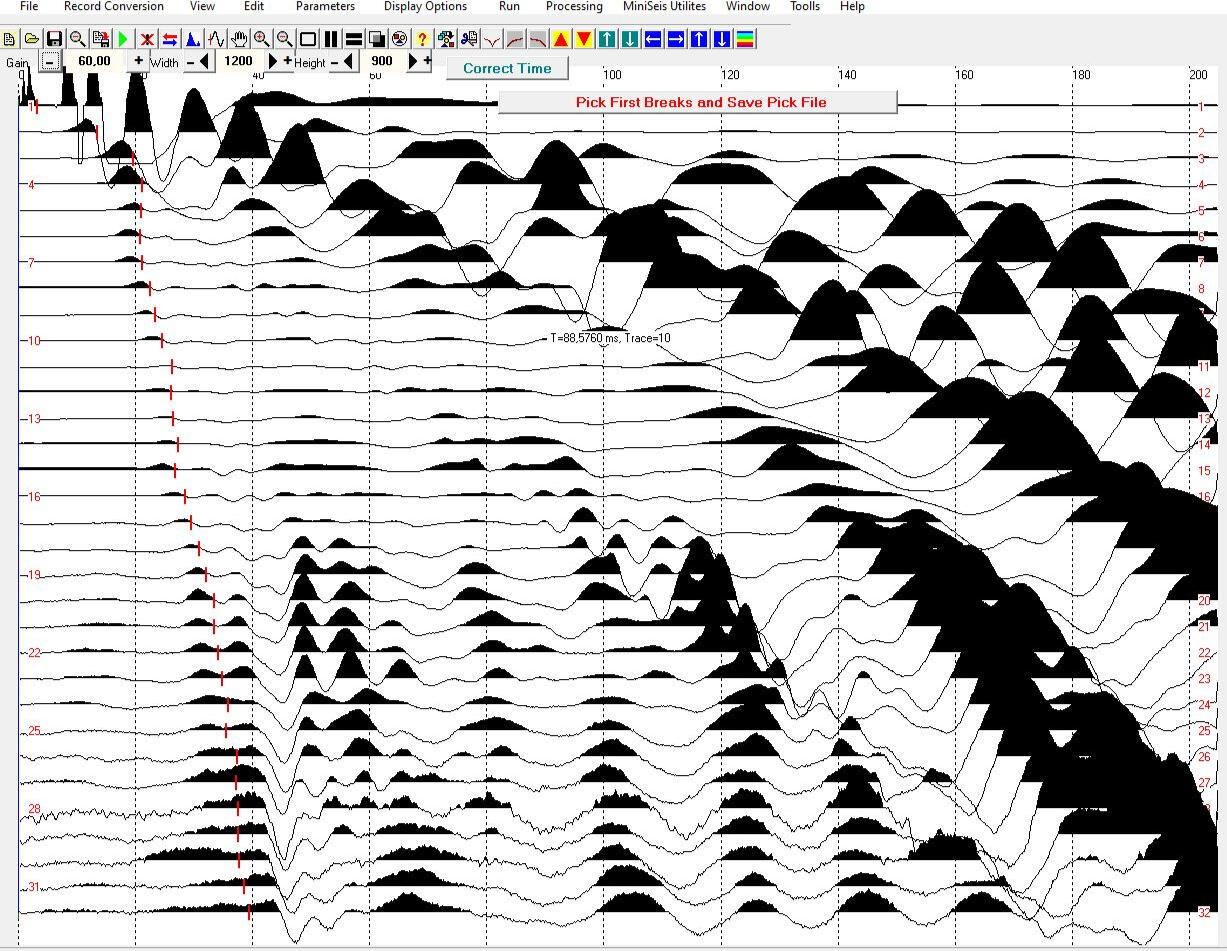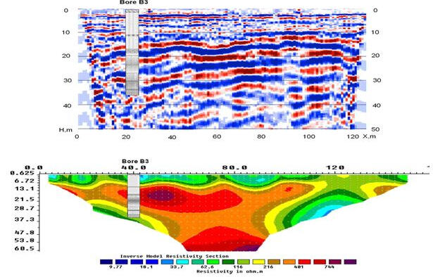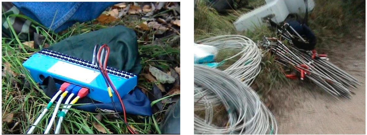 В проектном створе аварийного водосброса Плявиньской ГЭС проводились малоглубинные сейсмические исследования и электрометрия методом электротомографии вместе с геотехническим бурением, статическим и динамическим (стандартным) зондированием грунта. Сейсморазведка проводилась методами отраженных, рефрагированных и поверхностных волн с использованием всех видов упругих колебаний, регистрируемых на сейсмограммах вертикальными геофонами и полученных при единой расстановке из 32-х или 64-х канальных геофонов с расстоянием между каналами 2 м.