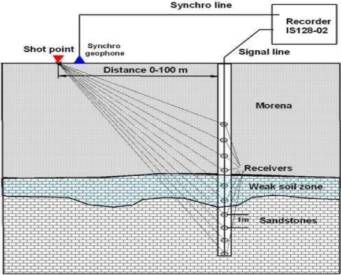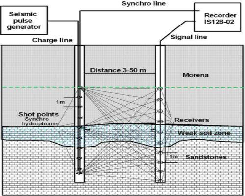 Измерения выполняются в трех скважинах, пробуренных на расстоянии 3 м друг от друга по одной линии. Скважины обсаживаются полиэтиленовыми трубами с обратным клапаном в нижней части обсадки и заполняются водой. Затрубное пространство тампонируется глиной, либо цементом, либо заполняется водой. В процессе измерений излучатель импульсов и приемник опускаются в соседние скважины на одинаковую глубину, предусмотренную техническим заданием, выполняется серия возбуждений импульса , регистрация суммарного сигнала, и затем излучатель и приемник перемещаются на новые позиции. Первый раз излучатель и приемник опускаются на глубину уровня воды в скважинах, затем перемещаются вниз по стволу с интервалом 1,0-1,5 м. В соответствии со стандартом ASTM D 4428/D 4428M-07 в одноканальном режиме выполняются две-три серии измерений времен пробега продольных и поперечных волн: с расположением излучателя в скважине 1, а приемников в скважине 2 на расстоянии 3 м и в скважине 3 на расстоянии 6 м от скважины 1. Синхронизация начала акустического импульса с началом записи выполняется при помощи стартового пьезодатчика, помещенного в один контейнер с излучателем и соединенного с регистратором по линии связи.