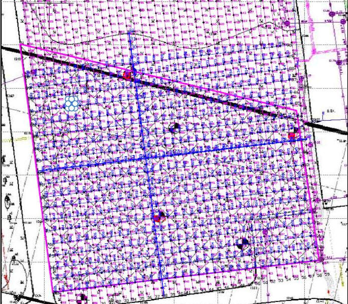 Непродольное вертикальное сейсмическое профилирование (ВСП) на участке проходки шахтных стволов выполнено по методике прямого просвечивания с расположением источников возбуждения сейсмического импульса по непродольным профилям на поверхности, а приемных гидрофонных зондов – в скважине. Схема расположения линий источников и контрольных скважин показана на рисунке слева. Шаг перемещения пунктов возбуждения по профилям – 4 м, шаг приемных гидрофонных зондов в скважине - 1 м. Из-за появления новых объектов на участке по мере строительства схемы расположения линий источников возбуждения существенно отличались на разных этапах исследований.