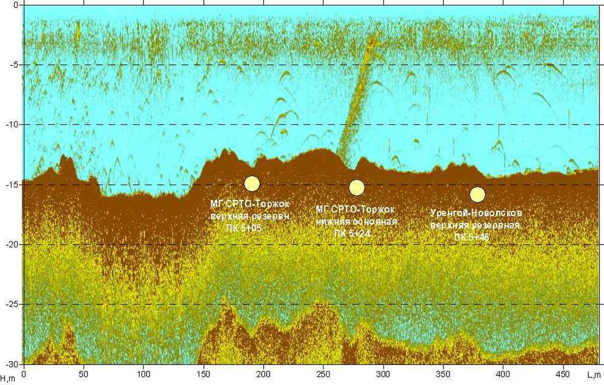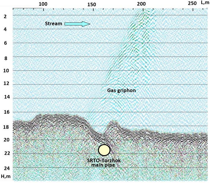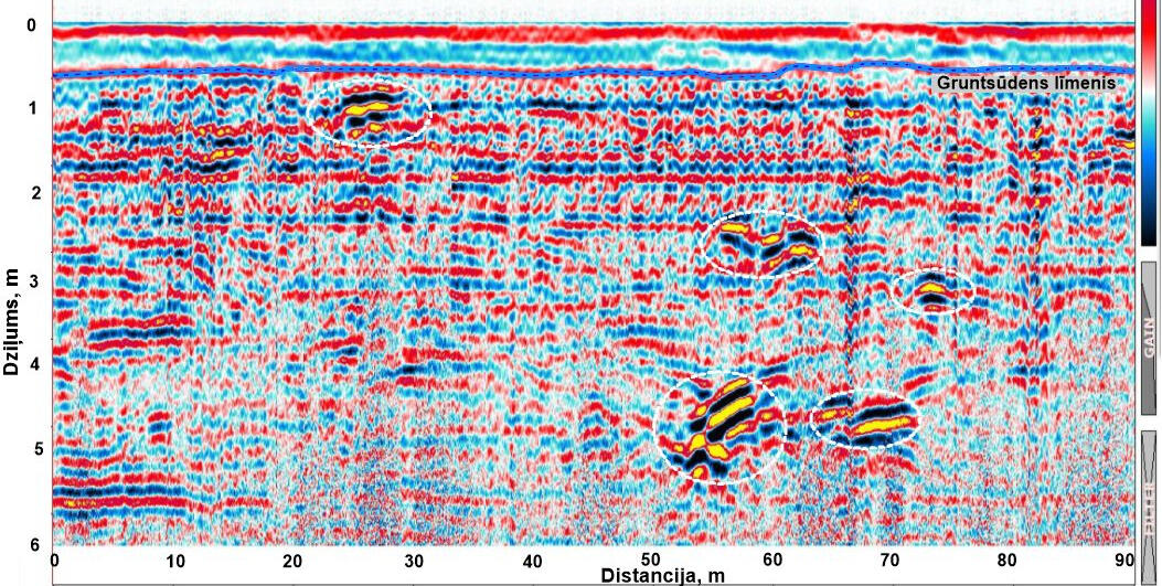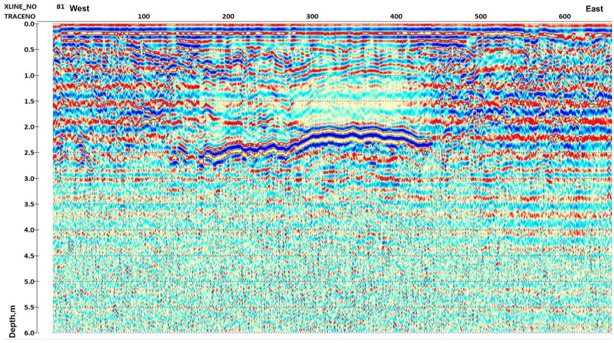 Под основной фазой отражения находятся области повышенной амплитуды сигнала, отраженного (рассеянного) на множестве мелких объектов. Такие объекты на георадарном профиле, скорее всего, интерпретируются как фрагменты бетона или асфальтового покрытия. Многие гиперболические оси фаз дифракционных волн зафиксированы на фрагменте профиля на глубине от 0,2 м до 1,0 м. Выраженные дифракции указывают на наличие в почве плотных инородных тел, возможно, фрагментов бетонных конструкций старого здания.На профиле отмечаются характерные дифракционные волны от более мелких объектов, таких как трубы, каналы связи, колодцы и т.п. На рисунке показаны примеры проявления таких объектов в виде гиперболических волновых пакетов.Низкочастотное радиолокационное зондирование является весьма эффективным методом картирования поверхности грунтовых вод в песчаных отложениях. В то же время поверхность водонасыщенных грунтов представляет собой жесткую экранирующую границу, ниже которой проследить отражающие границы в песчано-глинистом массиве проблематично.