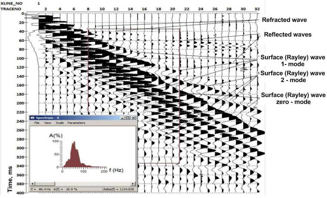 В инженерной сейсморазведке при использовании простейших поверхностных источников упругих колебаний свыше 85 процентов энергии удара уходит на формирование низкочастотных и низкоскоростных поверхностных волн. Приведенная ниже сейсмограмма, полученная на асфальтовом покрытии набережной с возбуждением импульса кувалдой весом 8 кГ, иллюстрирует доминирование на записи низкоскоростных поверхностных волн по отношению к рефрагированным и отраженным волнам. Являясь наиболее сильными помехами для метода отраженных волн, поверхностные волны Рэлея в то же время содержат весьма ценную для изучения свойств грунтов информацию о скоростях распространения поперечных волн.