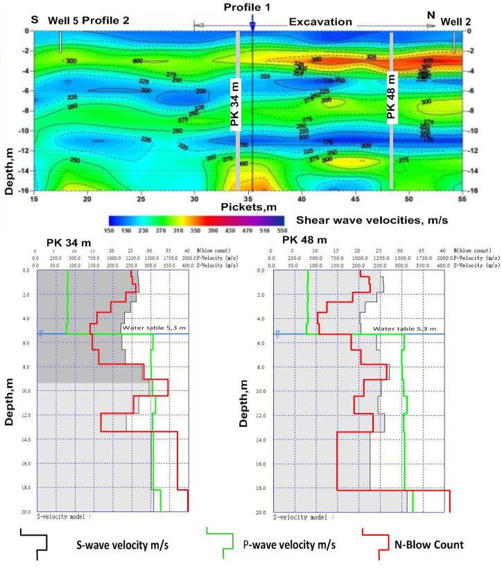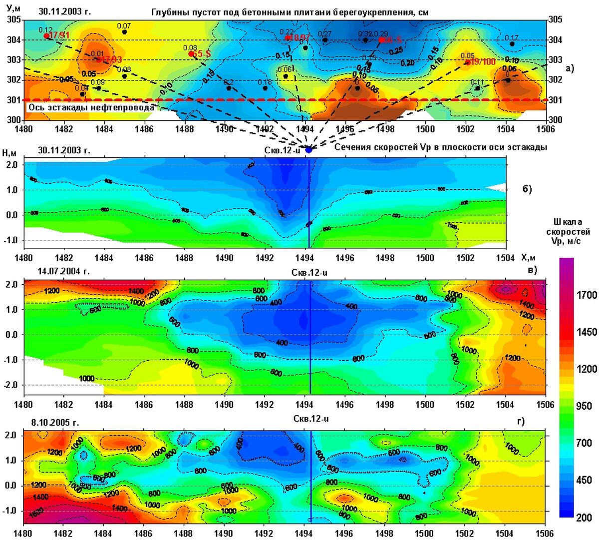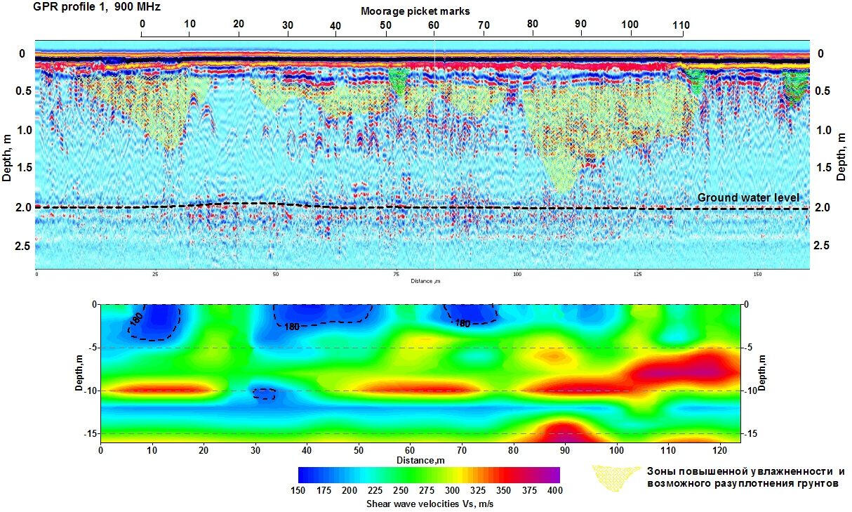 Наиболее информативным параметром, характеризующим зоны пониженной плотности, следует считать скорость распространения поперечных волн. По этому параметру и тесно связанному с ним расчету угла внутреннего трения в поверхностном слое сухого насыпного грунта достаточно четко выделяются 4 аномальные зоны, распространяющиеся на глубину 2-4 м. На значение этого параметра не влияет водонасыщение грунта, поэтому он может описывать свойства грунтового массива как над уровнем воды, так и на обводненной части интервала грунтов.