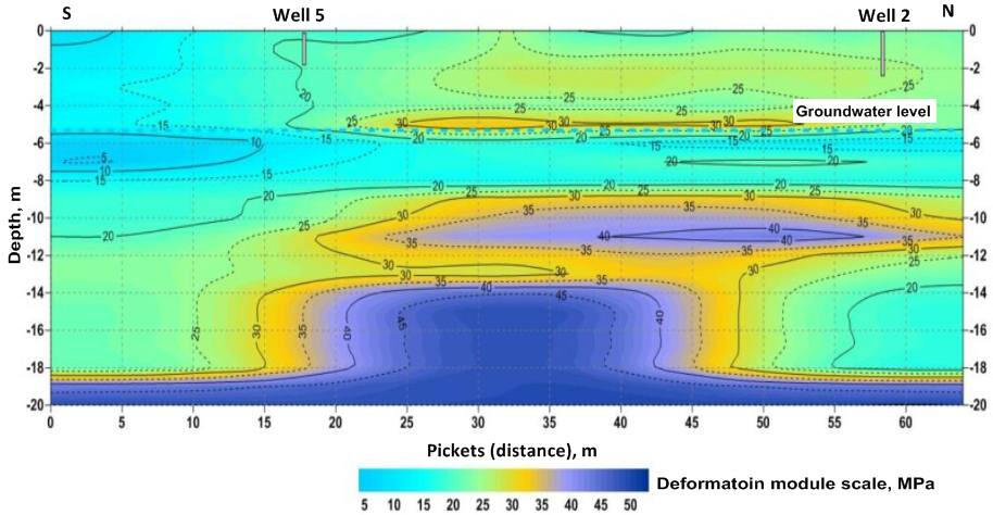 Разрез прогнозных значений модуля общей деформации моренных грунтов по одному из профилей на островном участке