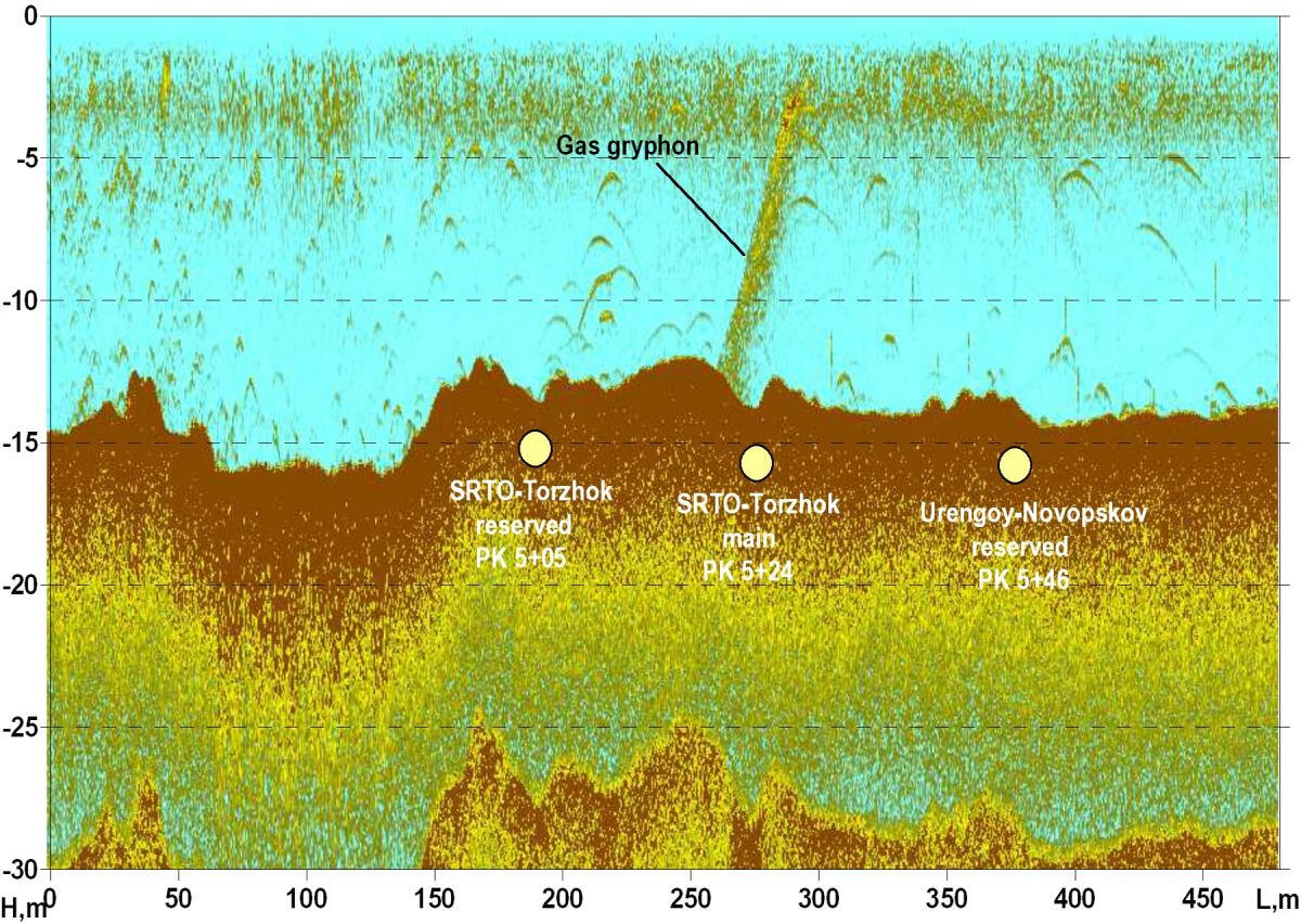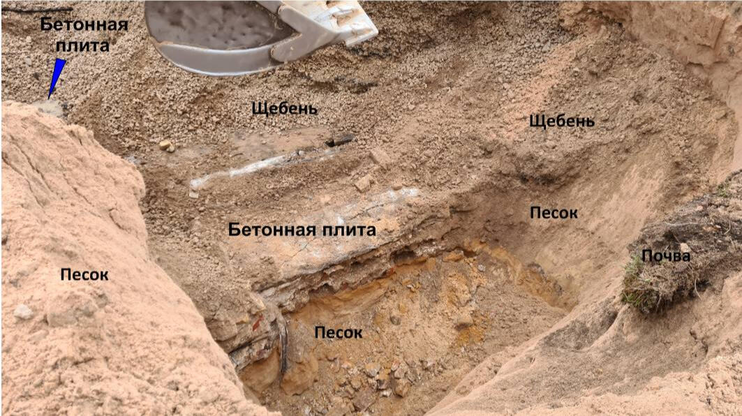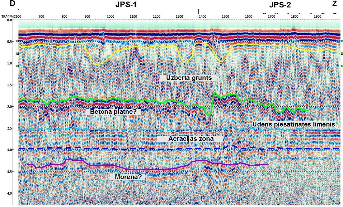 Прогиб отражающих горизонтов в кровле наземного массива может быть связан с оседанием слоя щебня и обводнением песка, что вызывает «задержку» времени регистрации отражения от нижележащих горизонтов.Радиолокационные профили с ограниченным проникновением зондирующего импульса в грунт ниже уровня грунтовых вод характеризуют в основном дренированный слой грунта глубиной до 2 м от поверхности зондирования. Эти участки в основном отражают обводнение песчаного слоя, которое может быть кратковременным.