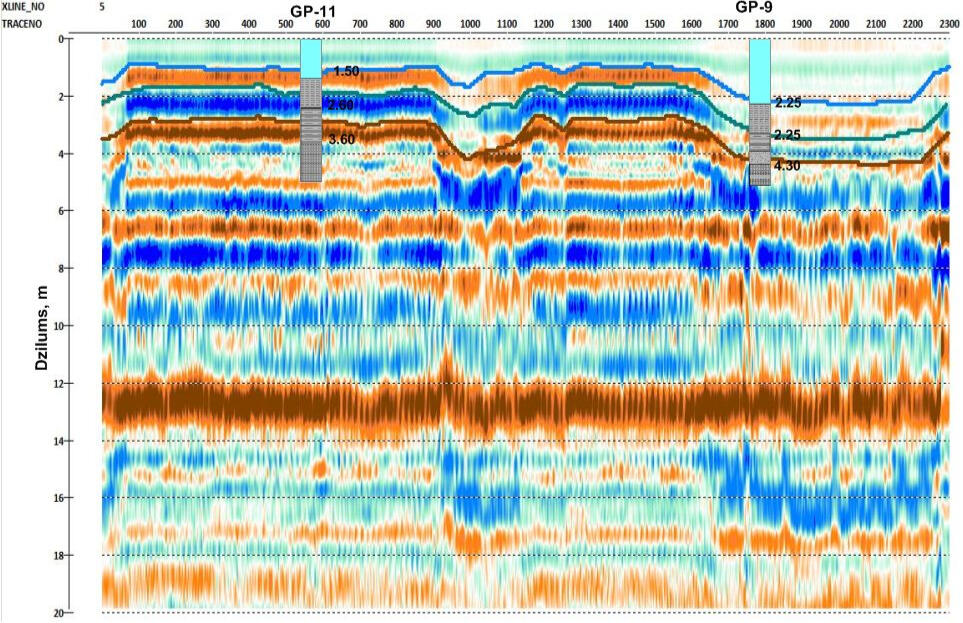 Разрез мини-ОГТ в масштабе глубин по профилю через погребенную доледниковую палеодолину. Участок расположения водозаборных скважин в п.Вангажи, Латвия