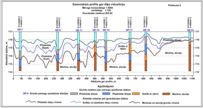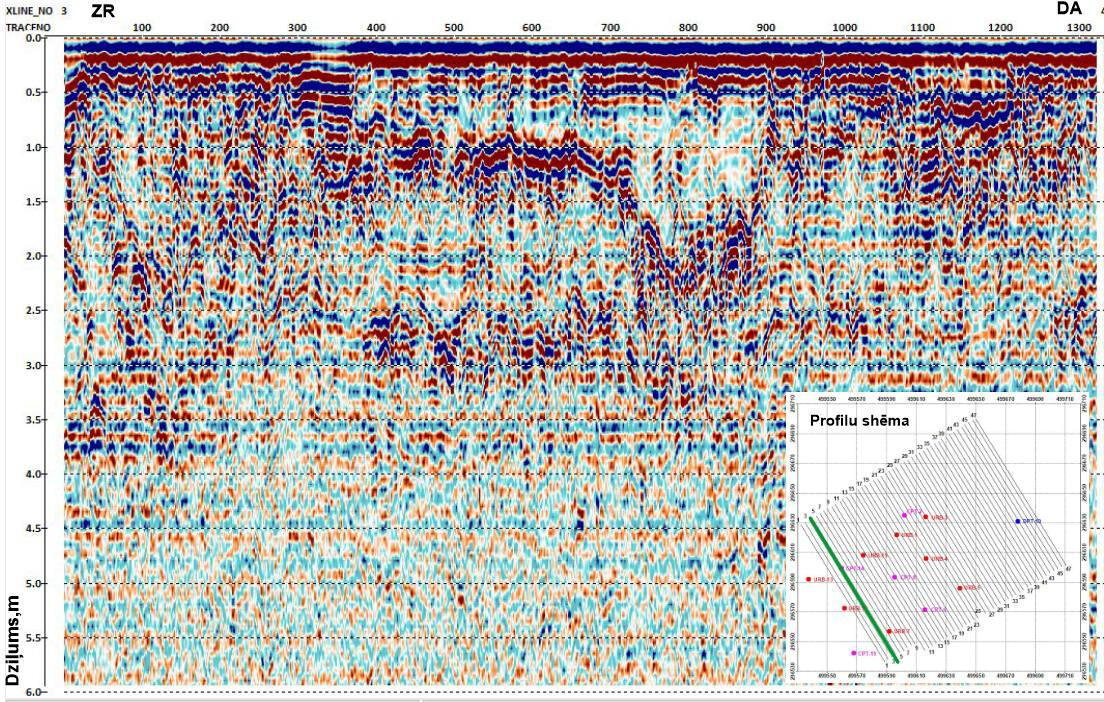 Верхняя часть разреза - аллювиальные отложения. В начальной части профиля, на борту долины – саласпилсские загипсованные карбонаты . Мощность доломитов невелика, практически весь врез в песчаниках аматской свиты. Борта нижней часть вреза сложены слабыми песчаниками аматской свиты верхнего девона. Скорость распространения продольных волн в них мало отличается от заполняющих долину моренных суглинков, поэтому борта вреза можно выделять только условно, по изменению характера слоистости.
