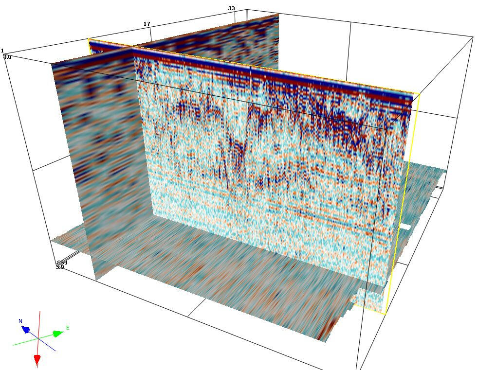 Для интерактивной интерпретации полученная объемная выборка скоростей может быть представлена кубом скоростей. Три ортогональные плоскости сечений могут интерактивно перемещаться для более наглядного представления о пространственном распределении аномалий скоростей.