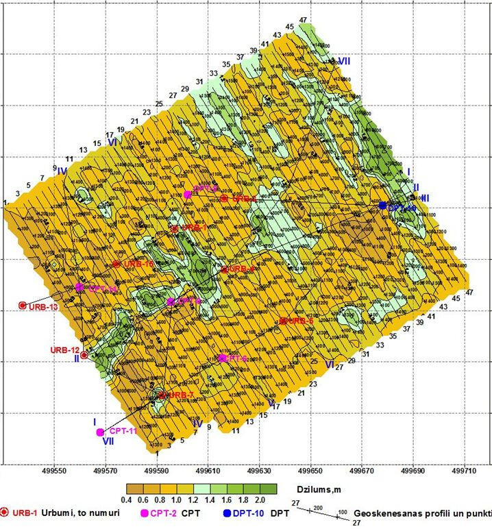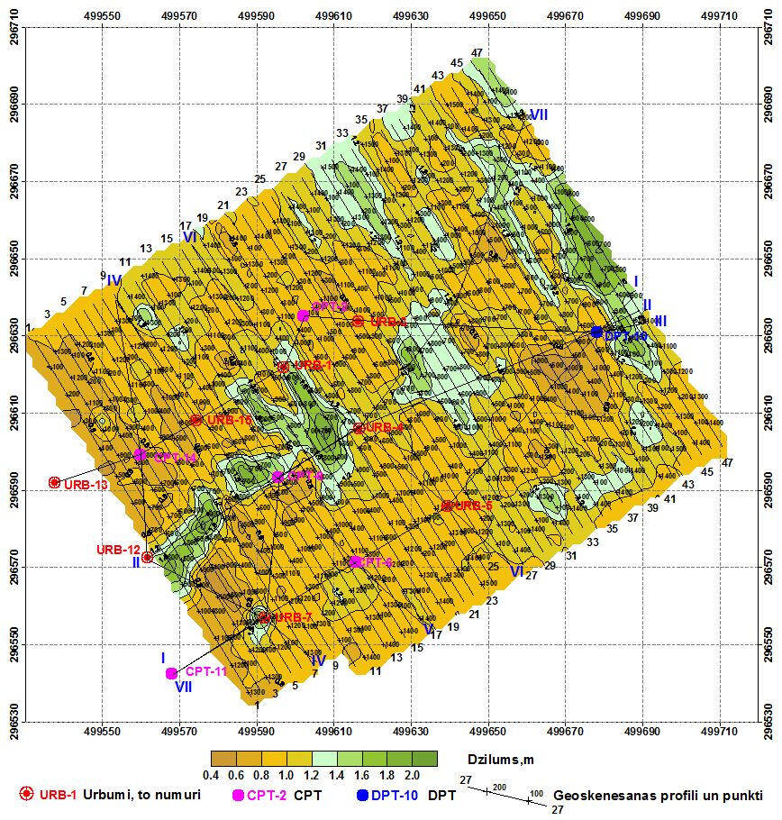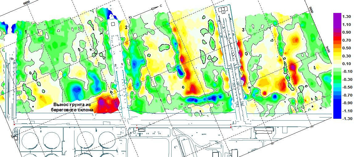 На исследуемом участке на большинстве георадиолокационных разрезов достаточно четко видна поверхность сложного отражающего горизонта, расположенного на глубине от 0,5 до 2,5 м. На участке на этой отражающей поверхности прослеживается несколько впадин глубиной от 1,0 до 2,5 м от поверхности. Самый глубокий из них имеет вид узкого оврага шириной 6-15 м и тянется от юго-западного края участка исследований до его центра в северо-восточном направлении. К западу от центра участка исследований следует более широкое, но менее глубокое (до 1,6 м) продолжение.На снимке представлена структурная карта поверхности днищ понижений. Глубина этих понижений иногда достигает 2,5 м. Широкая депрессия этой отражающей границы может наблюдаться в виде вытянутой на северо-запад впадины со сложной конфигурацией границы в плане вблизи северо-восточной границы участка. Судя по большому количеству локальных неоднородностей в слое выше этой границы, она представляет собой раздел техногенного грунтового заполнения от поверхности морских (или аллювиальных) песчаных и глинистых отложений.