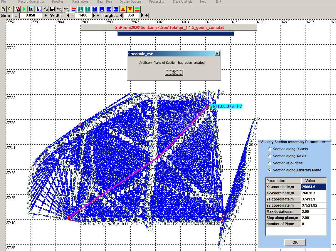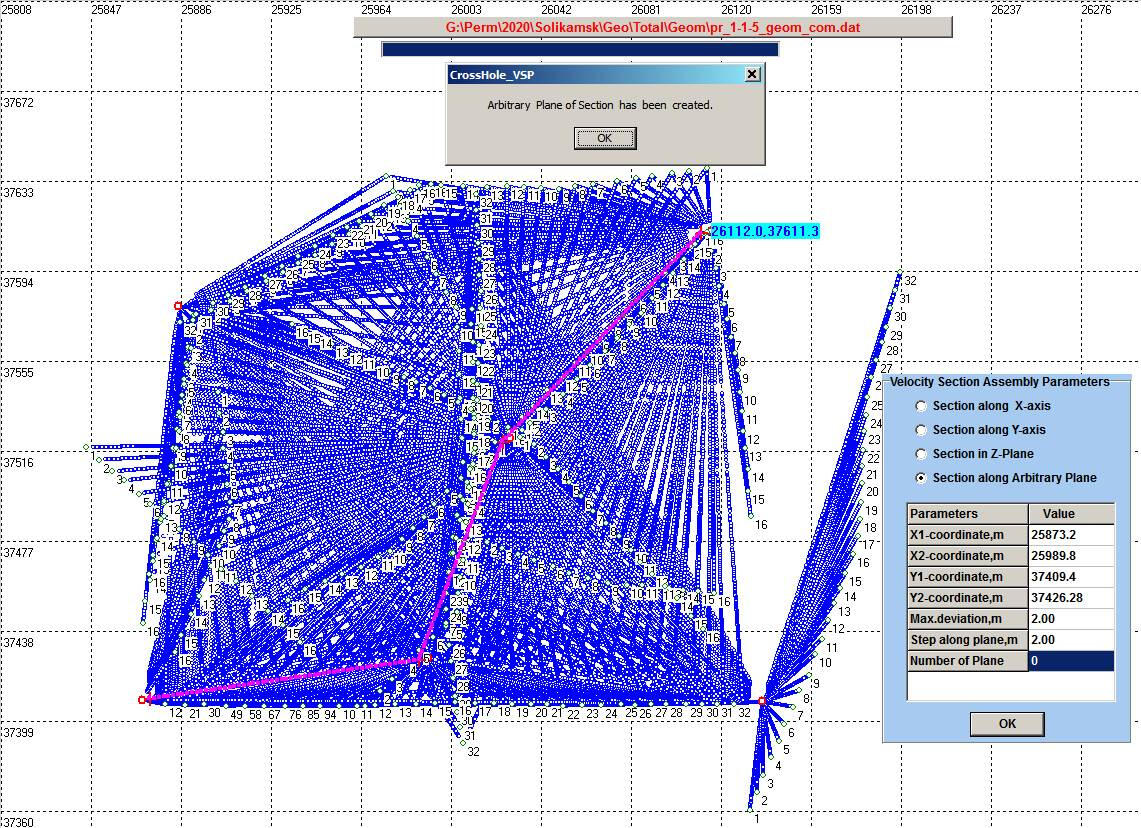 По совокупности подобранных скоростных моделей для каждой точки возбуждения собиралась пространственная координированная выборка скоростей, имеющая в пространстве форму перевернутой пирамиды. Компилятивная выборка по всем скважинам полигона представляла собой пространственный набор точек со значениями скоростей, аналогичный кубу скоростей, получаемому при обработке данных наземной сейсморазведки 3D. Последующий анализ распределения скоростей в массиве выполнялся по сериям произвольно ориентированных вертикальных и горизонтальных сечений полученной пространственной выборки.Вертикальное сечение куба скоростей может быть получено по произвольно ориентированному набору плоскостей через объем пространственной выборки. В данном примере проекции плоскостей сечений проходят вдоль заданного криволинейного профиля, в начале и в конце которого располагаются мониторинговые скважины.