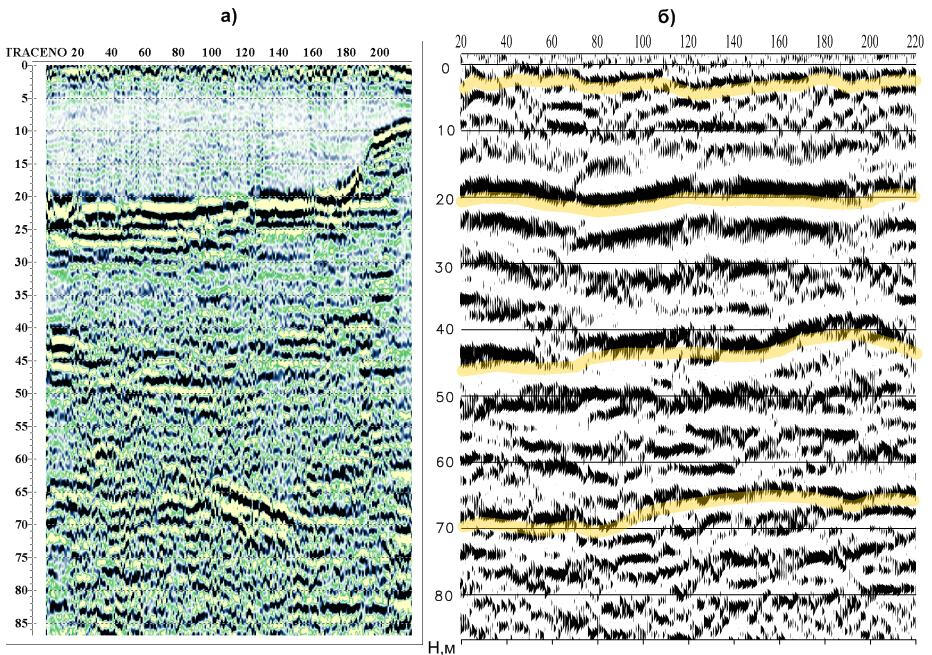 Временные разрезы метода отраженных продольных (а) и поперечных (б) волн