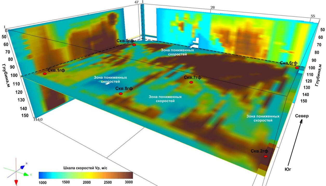 С помощью данной системы наблюдений возможно получить распределение скоростей упругих волн в околоскважинном пространстве, имеющем форму перевернутой пирамиды с основанием на поверхности наблюдений. С приближением к скважине увеличивается глубина изученной области пространства, но сокращаются ее поперечные размеры в горизонтальной плоскости.Куб скоростей распространения продольных волн строится на основе пространственной координированной выборки зачений расчетных скоростей на границах тонких слоев в точках преломления сейсмических лучей от источников на поверхности к приемникам в скважинах. Таким образом, он представляет собой генерализованную модель распределения истинных скоростей в околоскважинном пространстве.Приведенные сечения куба данных не предназначены для использования в каких-либо документированных приложениях – разрезах, картах и.т.п. Их назначение дать наглядное представление о локализации, размерах и конфигурации возможных крупных скоростных аномалий в породном массиве на полигоне.
