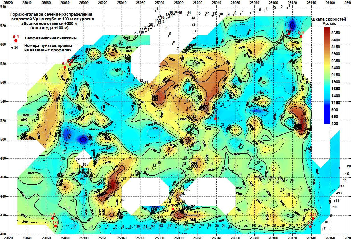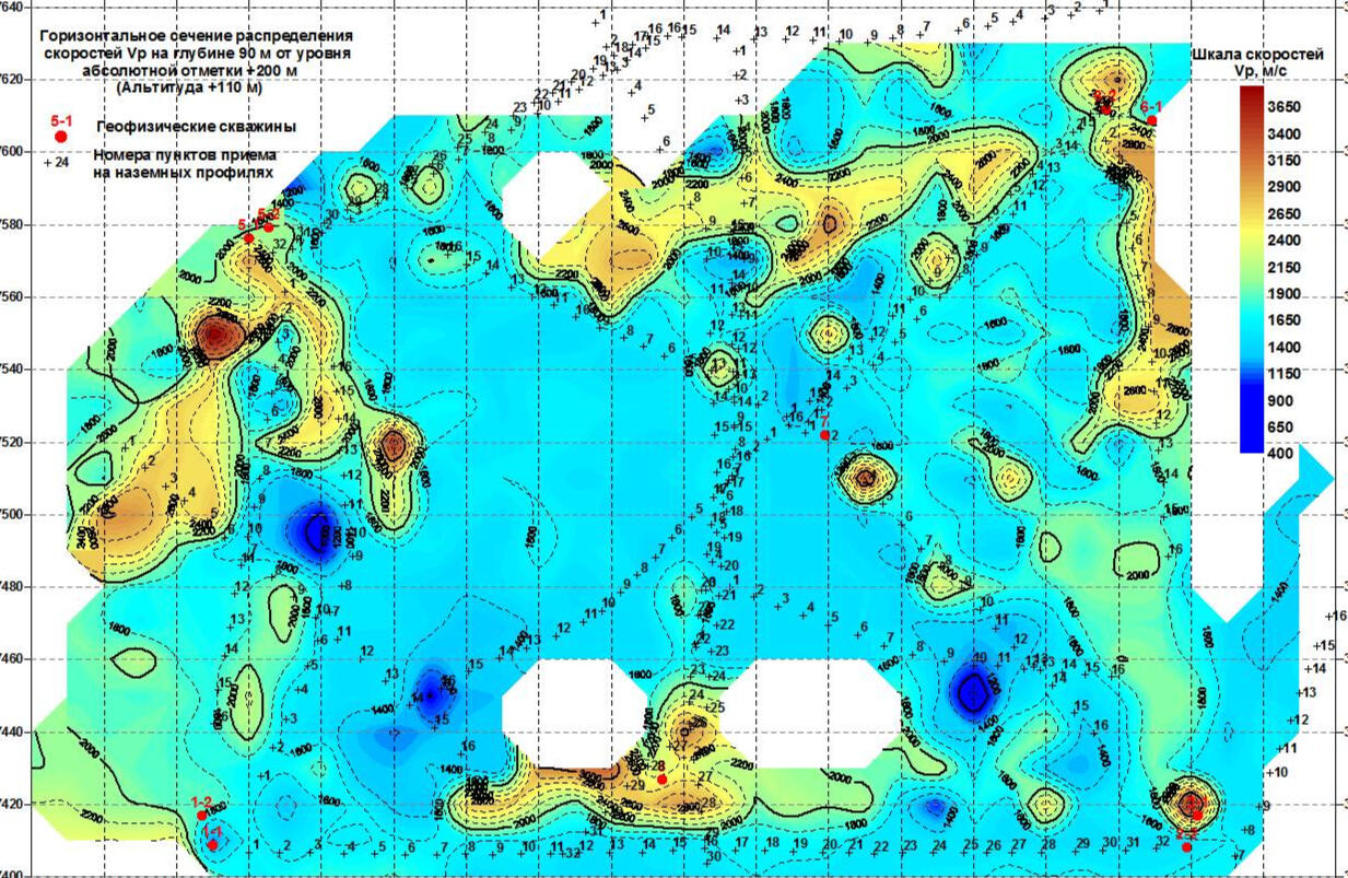 При обработке полученного массива данных по совокупности профилей наблюдения на поверхности собирается пространственная 3-х мерная выборка координированных значений скоростей, привязанных к различным отрезкам сейсмических лучей. Для геологической интерпретации данных по этой выборке рассчитываются горизонтальные и вертикальные сечения скоростей, отображающие локальные неоднородности массива грунтов и коренных пород.Компилятивная выборка по всем скважинам полигона представляет собой пространственный набор точек со значениями скоростей, аналогичный кубу скоростей, получаемому при обработке данных наземной сейсморазведки 3D. Последующий анализ распределения скоростей в массиве выполняется по сериям произвольно ориентированных вертикальных и горизонтальных сечений полученной пространственной выборки. Пример такого горизонтального сечения по абсолютной отметке +110 м (приблизительно на глубине 90 м от поверхности) приведен на рисунке слева.