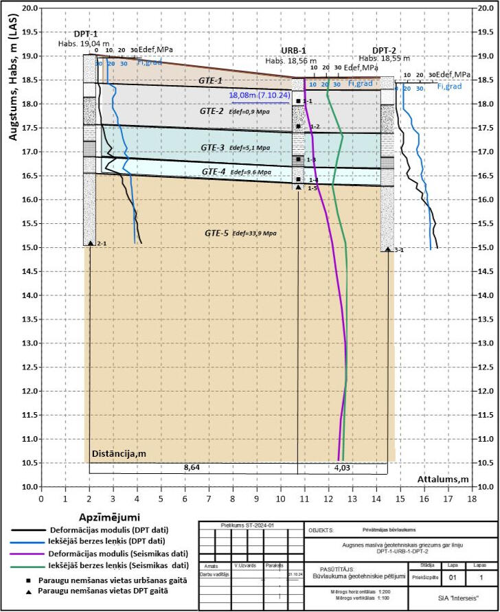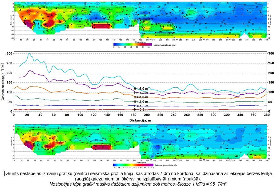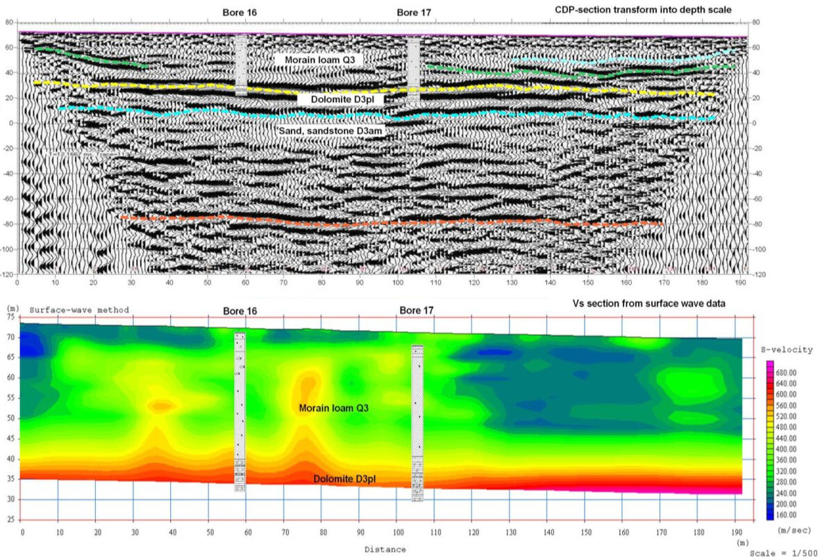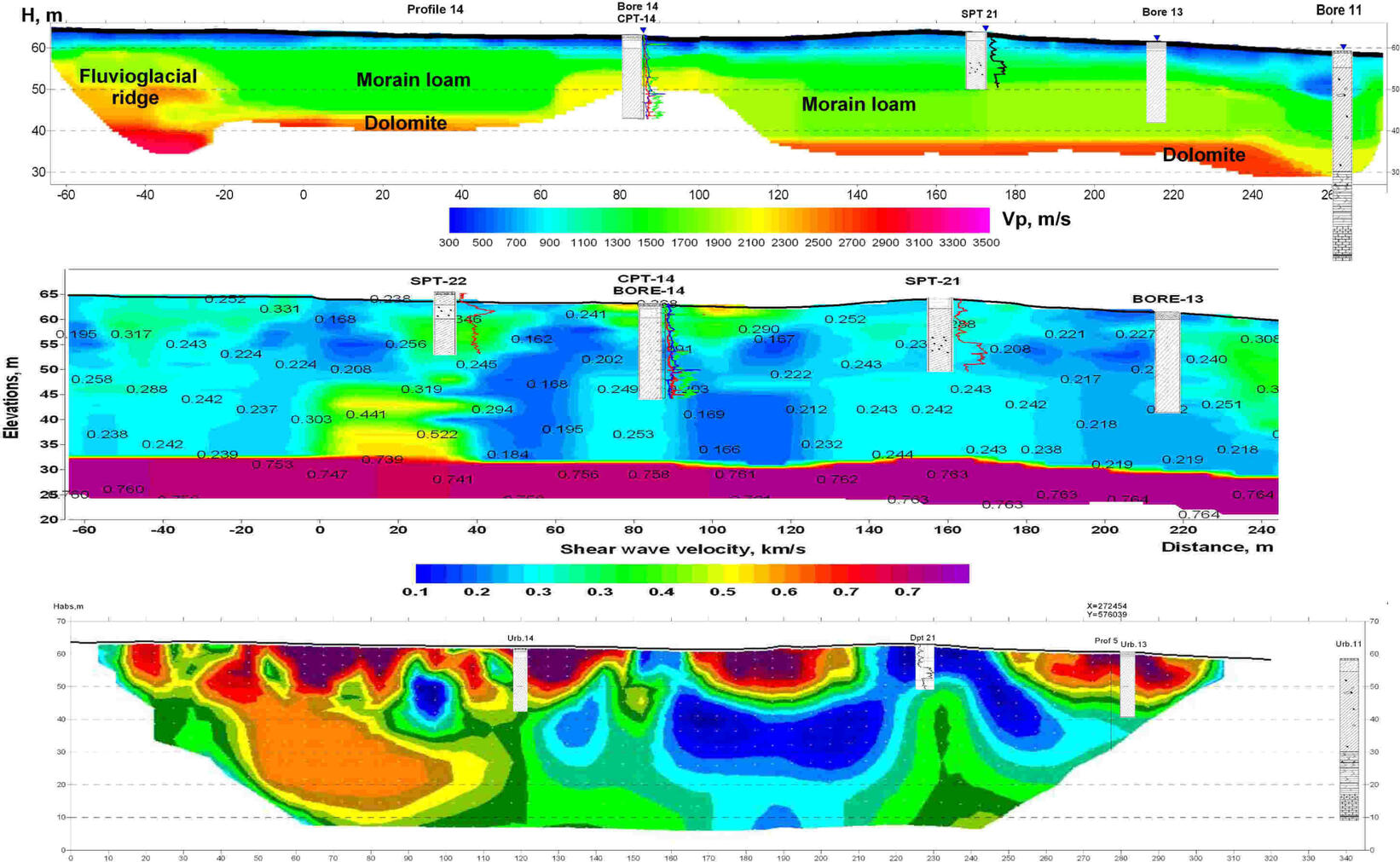Приведенные на рисунке разрезы характеризуют типичное соотношение представительности геотехнических методов, бурения и геофизики при оценке физических свойств грунтового массива. Несмотря на достаточно высокую плотность точек бурения и динамического зондирования, они не обеспечивают пространственного построения границ инженерно-геологических элементов внутри относительно однородного массива моренных суглинков. В то же время скорости поперечных волн, характеризующие, в первую очередь, свойства скелета грунта, дают наглядную пространственную картину распределения в моренных суглинках скоплений крупнообломочной фракции (моренных гряд) с повышенными скоростями распространения поперечных волн.При инженерных изысканиях для оценки состояния и свойств грунтового массива и насыщающих его флюидов обычно используются несколько типов волн: продольные отраженные, рефрагированные и поверхностные. На приведенном рисунке показаны разновидности сейсмических разрезов по одному из профилей в центральной части Латвии. В верхней части разреза до 35 м моренных суглинков, затем около 20 м плявиньских доломитов, ниже – аматско-гауйские песчаники. На глубине 160 м (оба разреза в масштабе глубин) на разрезе ОГТ следится достаточно выдержанная граница, возможно подошва аматско-гауйских песчаников.Эти материалы получены с использованием кувалды весом 8 кГ и единой 64-х канальной приемной расстановки геофонов с шагом 2 м. Однако трудоемкость полевых работ и обработки данных для получения этих разрезов существенно различается. Так, если для получения разреза ОГТ по отраженным волнам интервал между пунктами возбуждения был 2 м, то для получения разрезов по рефрагированным и поверхностным волнам были использованы только сейсмограммы, полученные с шагом пунктов возбуждения по профилю 16 м.
