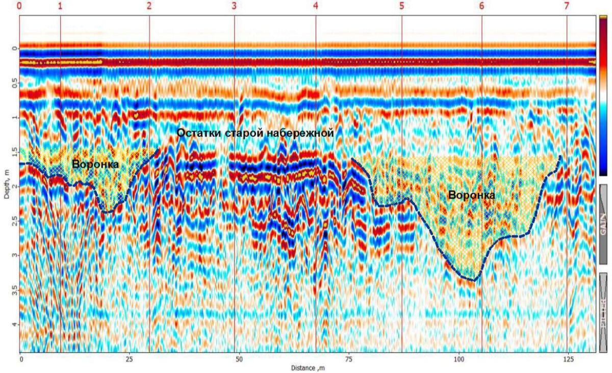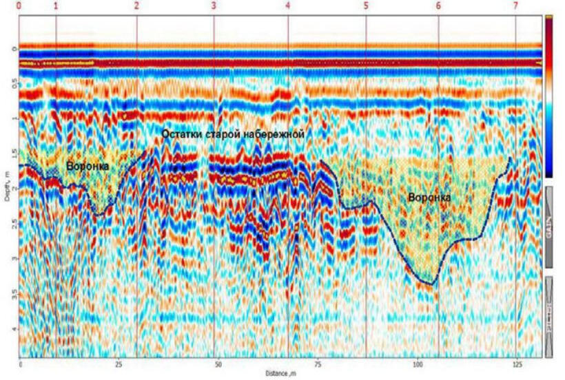Выявление выноса грунтов основания пирса с помощью сейсмического профилирования и георадара