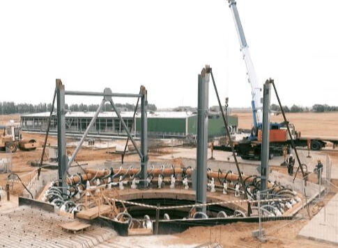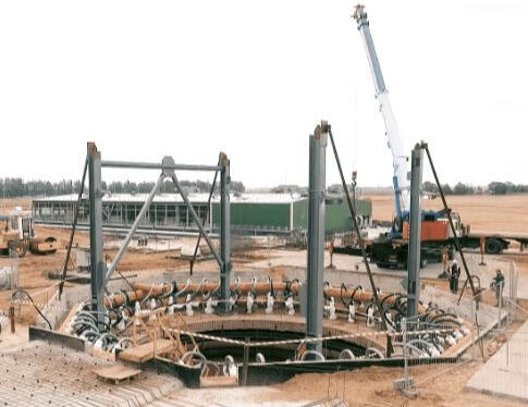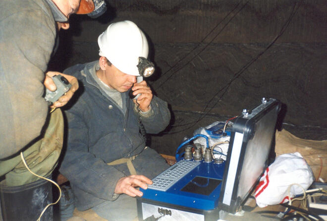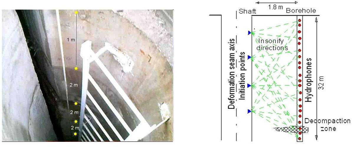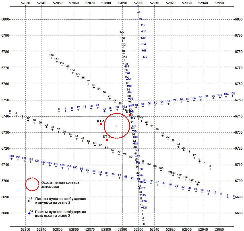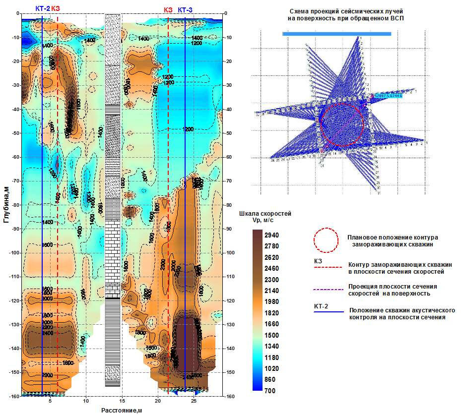 Работы выполнялись в три этапа: до начала заморозки, в средней стадии заморозки и после окончания заморозки ледовопородного ограждения после начала проходки шахтных стволов. Заморозка выполнялась путем прокачки низкотемпературного азота по замораживающим скважинам, расположенным кольцом по контуру стенок шахтного ствола. Акустические измерения проводились в 3-х контрольных скважинах, расположенных в 2-3 м за пределами внешнего контура замораживающих скважин.Наблюдения выполнялись методом непродольного ВСП по профилям, расположенным за пределами контура замораживающих скважин, и методом межскважинного просвечивания между каждыми контрольными скважинами через породный массив проектного шахтного ствола.