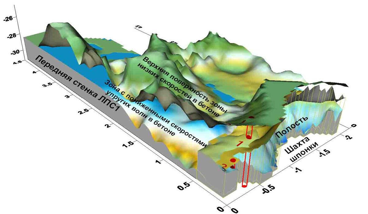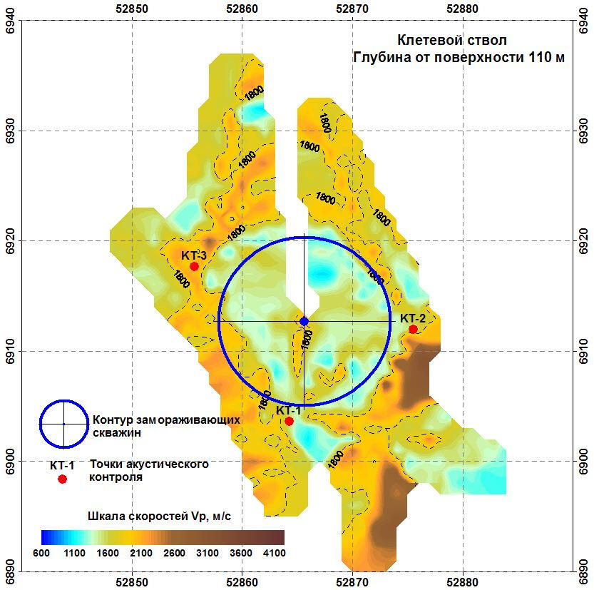 Горизонтальные сечения полученной объемной выборки скоростей на различных глубинах позволили охарактеризовать распределение скоростей и увязать их с особенностями литологии и гидродинамического режима породного массива. Соответственно, это позволило оценить степень и качество заморозки ледопородного ограждения в различных интервалах проходки ствола.