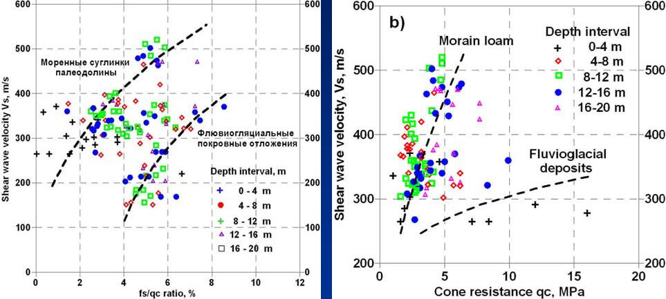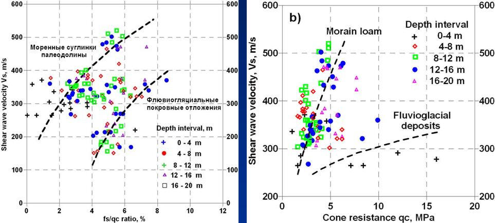 Графики зависимостей между скоростью поперечных волн и параметрами статического зондирования, полученные на участке водосброса