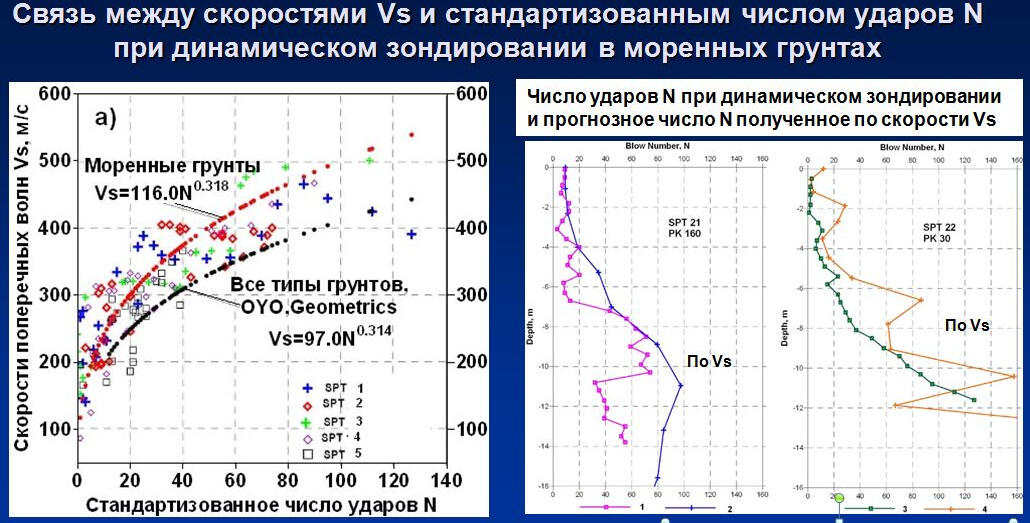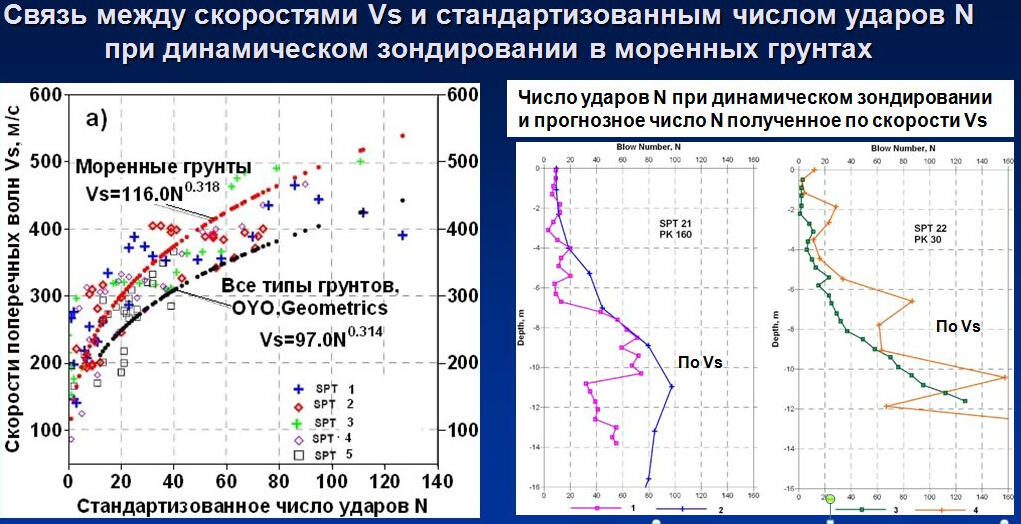 Корреляция графиков зависимости между скоростью поперечных волн и стандартизованным числом ударов N при динамическом зондировании в моренных грунтах