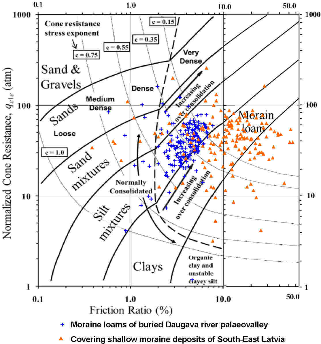 При невозможности получения на островном участке данных статического зондирования и отбора образцов грунта для лабораторных тестов для классификации типов и оценки физических свойств моренных отложений, заполняющих долину, использовались модифицированная с учетом местных условий номограмма Олсена и скорректированные по данным геофизики и геотехники на берегу статистические зависимости.