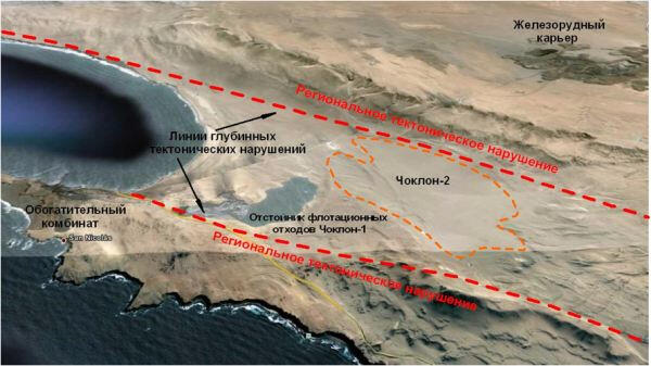 Отстойник флотационных отходов железо-рудного комбината Choclon-II фирмы Show Gang (Перу)