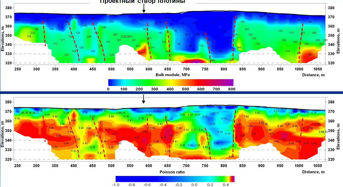 Выходы скальных пород и разрез модуля всестороннего сжатия по сейсмическим данным через створ проектной плотины
