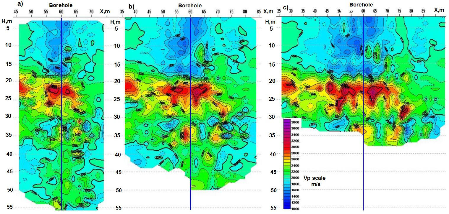 Провалы надсоляной толщи произошли во многих участках жилой и промышленной застройки г. Березники. На еще большем числе участков отмечаются проседания грунтовой толщи над шахтными выработками. Скорость проседания может достигать в отдельных местах до 40 см за год. На многих выявленных участках проседания пробурены мониторинговые скважины, в которых выполняются периодические исследования методами скважинной сейсморазведки совместно с наземными профильными наблюдениями. Наблюдения методом непродольного ВСП выполняются по сети произвольно расположенных профилей (в зависимости от характерна рельефа и препятствий). При прямом ВСП источники возбуждения упругих волн располагаются на поверхности, а приемники сигналов – в скважине. При инверсном ВСП имеет место обратное расположение.На приведенном слева рисунке – результат измерений скоростей упругих волн по трем параллельным профилям, расположенным на удалении 10, 12, и 14 м от скважины с приемниками. На участке наблюдений скорость проседания земной поверхности составляет 11 см в год. Участок наиболее интенсивного проседания отображается на профилях резко пониженными скоростями распространения упругих волн вблизи мониторинговой скважины.