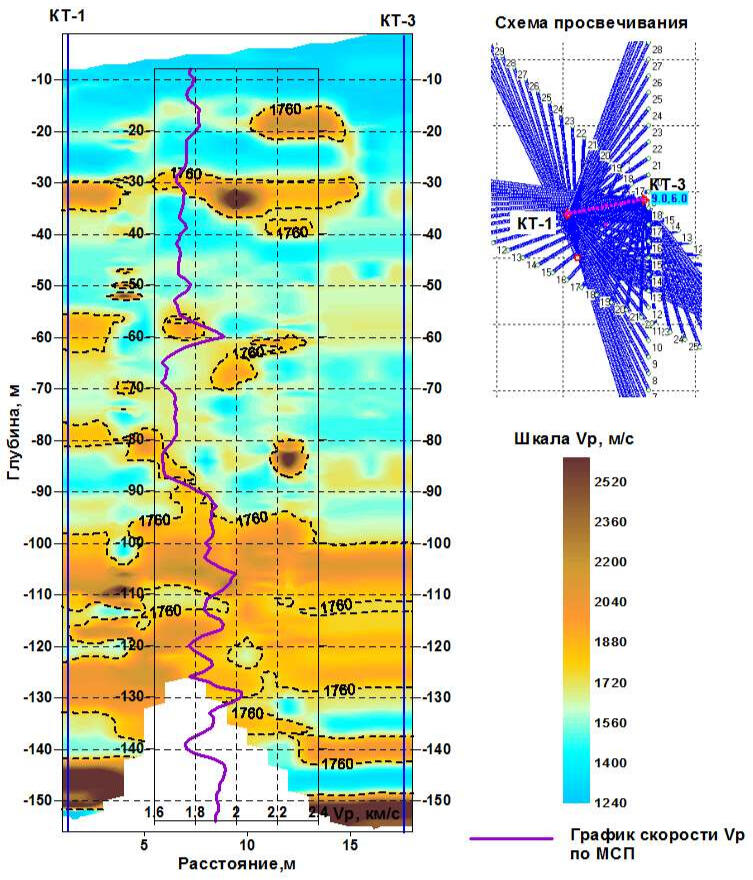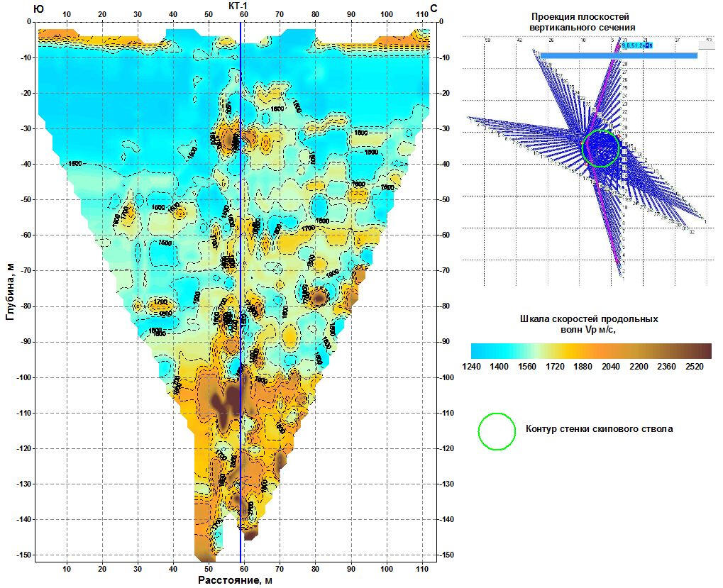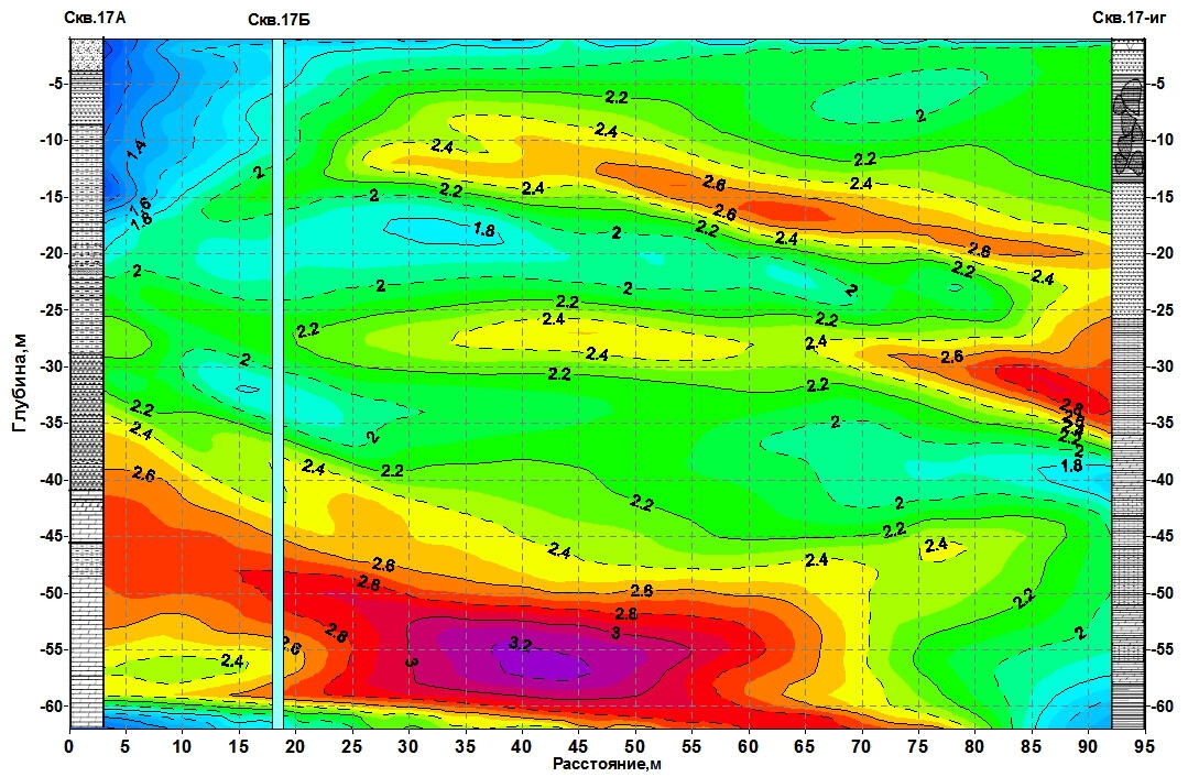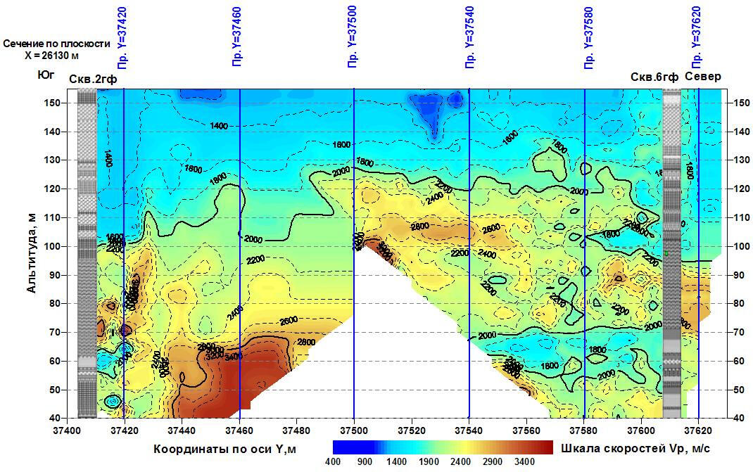 Вертикальные сечения скоростей могут быть выполнены по произвольно заданным комбинациям вертикальных плоскостей, проекции которых на дневную поверхность имеют вид ломаной линии. В отдельных случаях бывает целесообразно построить сечение вдоль наклонной плоскости, секущей под произвольно заданным углом пространственную выборку координированных значений скоростей.На рисунке приведен пример вертикального сечения скоростей продольных волн по профилю, проходящему через две геотехнические скважины, одна из которых расположена в зоне ускоренного проседания земной поверхности над обводненной шахтной выработкой в толще солей.