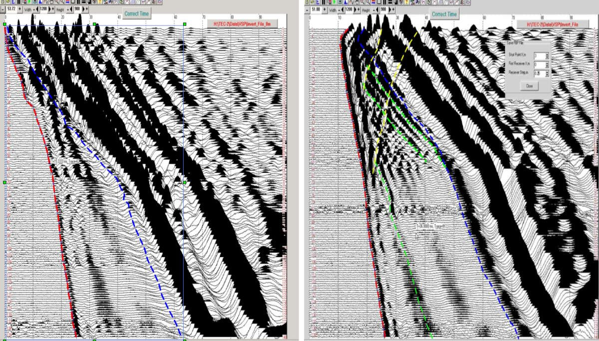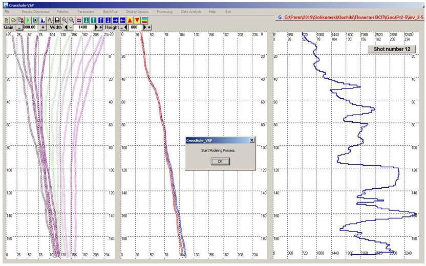 Разработка уникальных программ обработки данных велась параллельно с развитием методики полевых работ методами непродольного ВСП и межскважинного сейсмопросвечивания. Практически каждый новый объект исследования вследствие значительных различий сейсмогеологических условий, площади и глубины исследований требовал разработки новых алгоритмов и структуры обрабатывающих модулей. Ядром алгоритма являлся модуль адаптивного моделирования неоднородно-слоистой скоростной среды путем минимизации функционала времени пробега упругой волны от источника к приемнику. Пример построения скоростной модели среды на основе метода межскважинного просвечивания с использованием принципа минимальных отклонений серии теоретических годографов от наблюденных показан на рисунке слева.